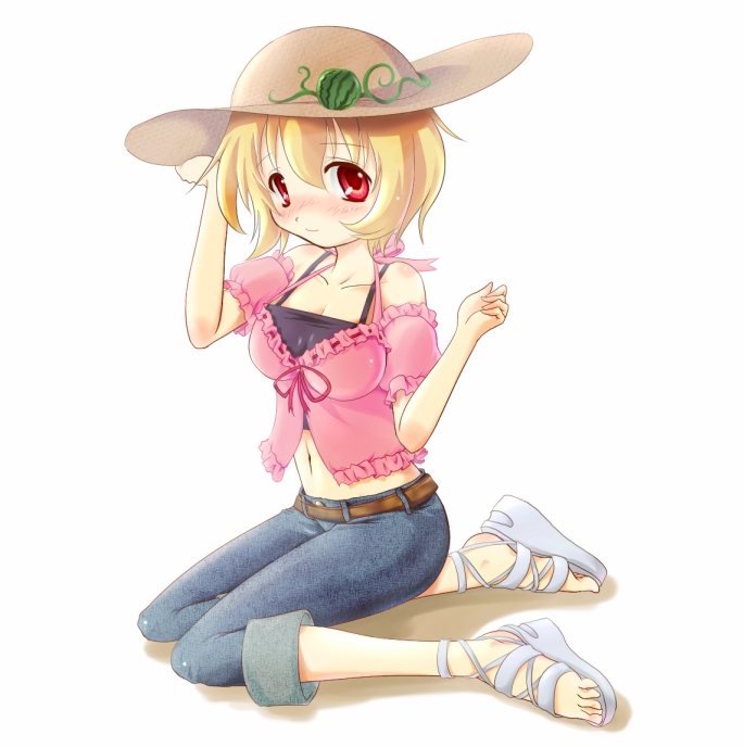 1girlalternate costumeblonde hairbreastscontemporaryfemale focusfoodfood-themed clothesfruitfull bodyhatmidriffnavelred eyessandalsshort hairsolostraw hatwatermelonwhite background
