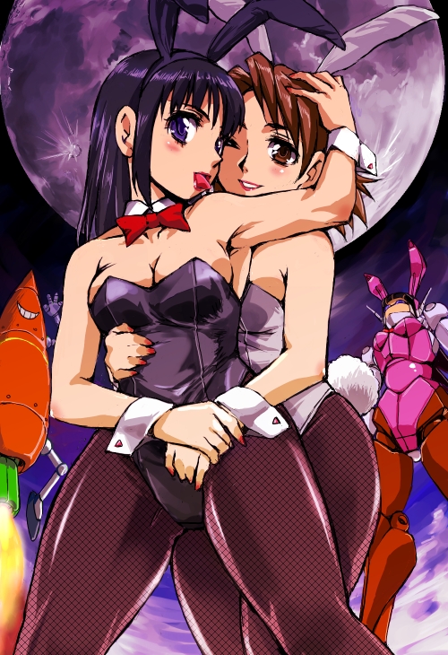 2girlsanimal earsarmpitsblack hairblushbowbowtiebrown eyesbrown haircarrotfake animal earsfishnet pantyhosefishnetsfull moonholding handshughug from behindlaunchlipslipsticklong hairmakeupmechamoonmultiple girlsone eye closedpantyhoseplayboy bunnypurple eyesrabbit earsrabbit tailrobotrocketshort hairtailtonguewinkwrist cuffsyuri