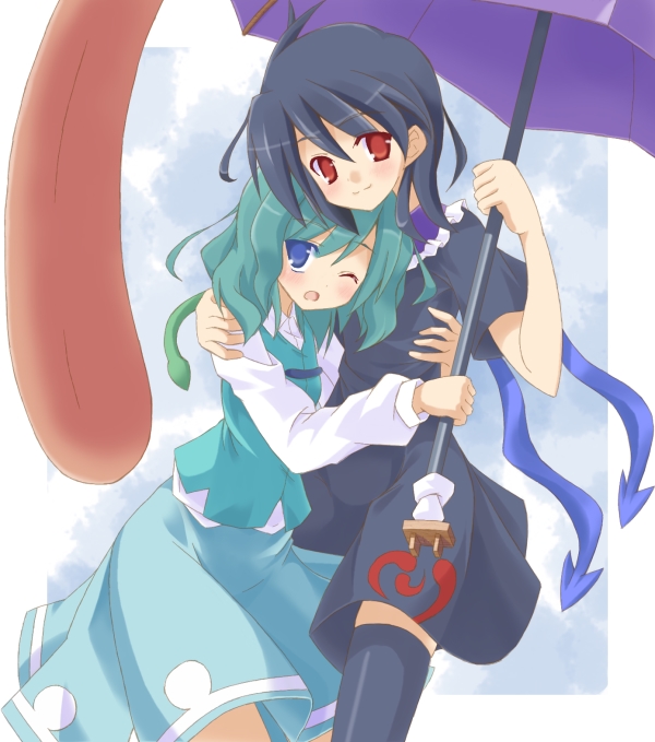 2girlsblack hairblushdressfemale focusgreen hairkarakasa obakemultiple girlssnakethighhighstongueumbrellawings