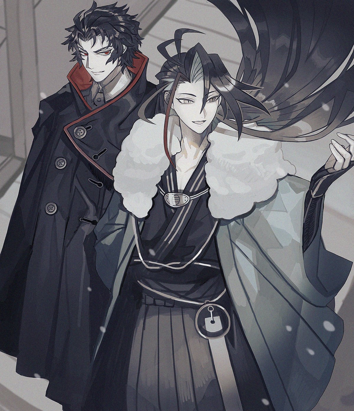 2boysantenna hairblack haircloakcurtained hairfalling petalsgrey eyeshaoriheterochromiajapanese clotheskimonolong hairlong sleevesmale focusmultiple boysopen mouthpetalsqex3qred eyesshirtshort hairsmile