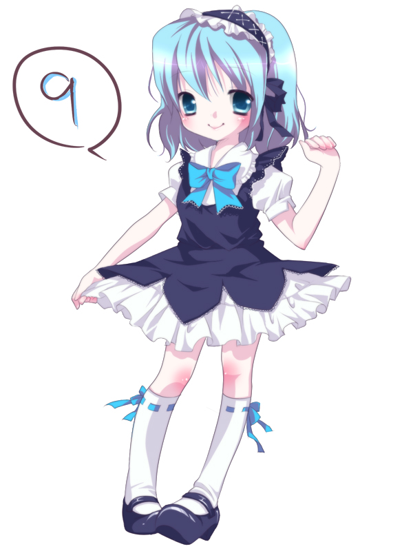 black shoesblue bowblue bowtieblue eyesblue hairbowbowtiecircled 9cosplayfrederica bernkastel (cosplay)full bodyhairbandkneehighsmary janesribbon trimribbon-trimmed socksshoesshort hairsimple backgroundskirtskirt tugsockssolospeech bubblestandingwhite backgroundwhite socks