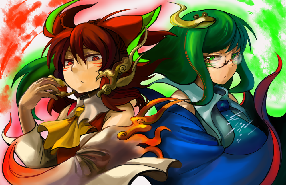 2girlsbespectacledbowbrown hairdetached sleevesfemale focusfrogglassesgreen eyesgreen hairhair ornamentjapanese clotheslong hairmikomultiple girlsred eyesshort hair
