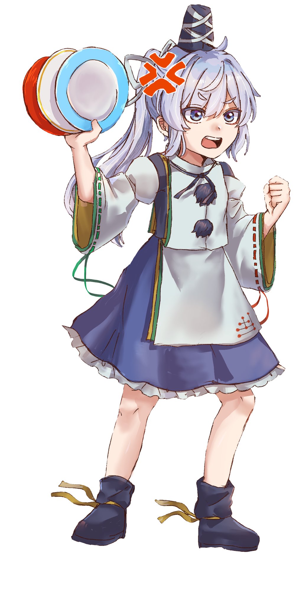 1girlanger veinblue bootsblue eyesblue hairblue hatblue skirtbootsclenched handfrilled skirtfrillsfrownfull bodyhatholdingjapanese clotheskariginuopen mouthpom pom (clothes)ponytailribbon trimribbon-trimmed sleevessimple backgroundskirtsolotate eboshiteethupper teeth onlywhite background