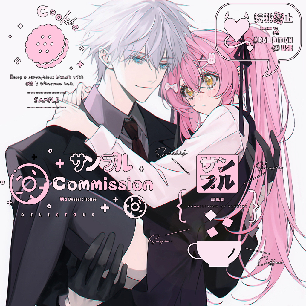 1boy1girlblack glovesblack jacketblack ribbonblack thighhighsblue eyesblushbowbrown necktiecarryingclosed mouthcollared shirtcoupledresseyelashesgloveshair between eyeshair bowhair ornamenthair ribbonhairpinheterojacketlapelslong hairlooking at viewermolemole under eyenasukichi777necktienotched lapelspink hairprincess carryribbonsample watermarkshirtshort hairsmilesquarethighhighstoo many watermarkstwintailswatermarkwhite hairwhite shirtyellow eyes