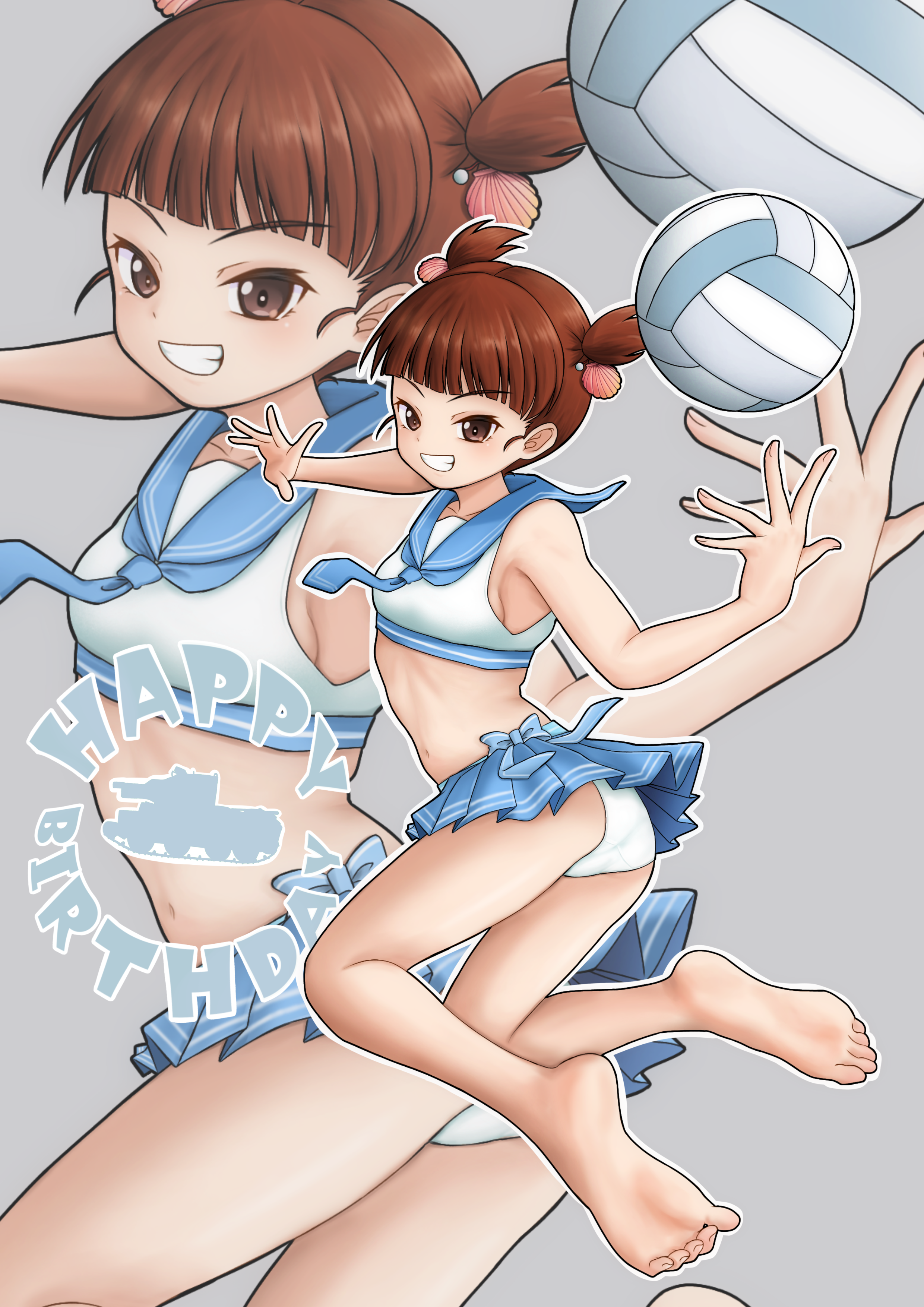 1girlassballbikinibikini skirtblushbrown eyesbrown hairdressgrey backgroundgrinhair ornamentlooking at viewermultiple viewssailor dressshellshell hair ornamentshort hairsimple backgroundsmileswimsuittwintailsvolleyballvolleyball (object)