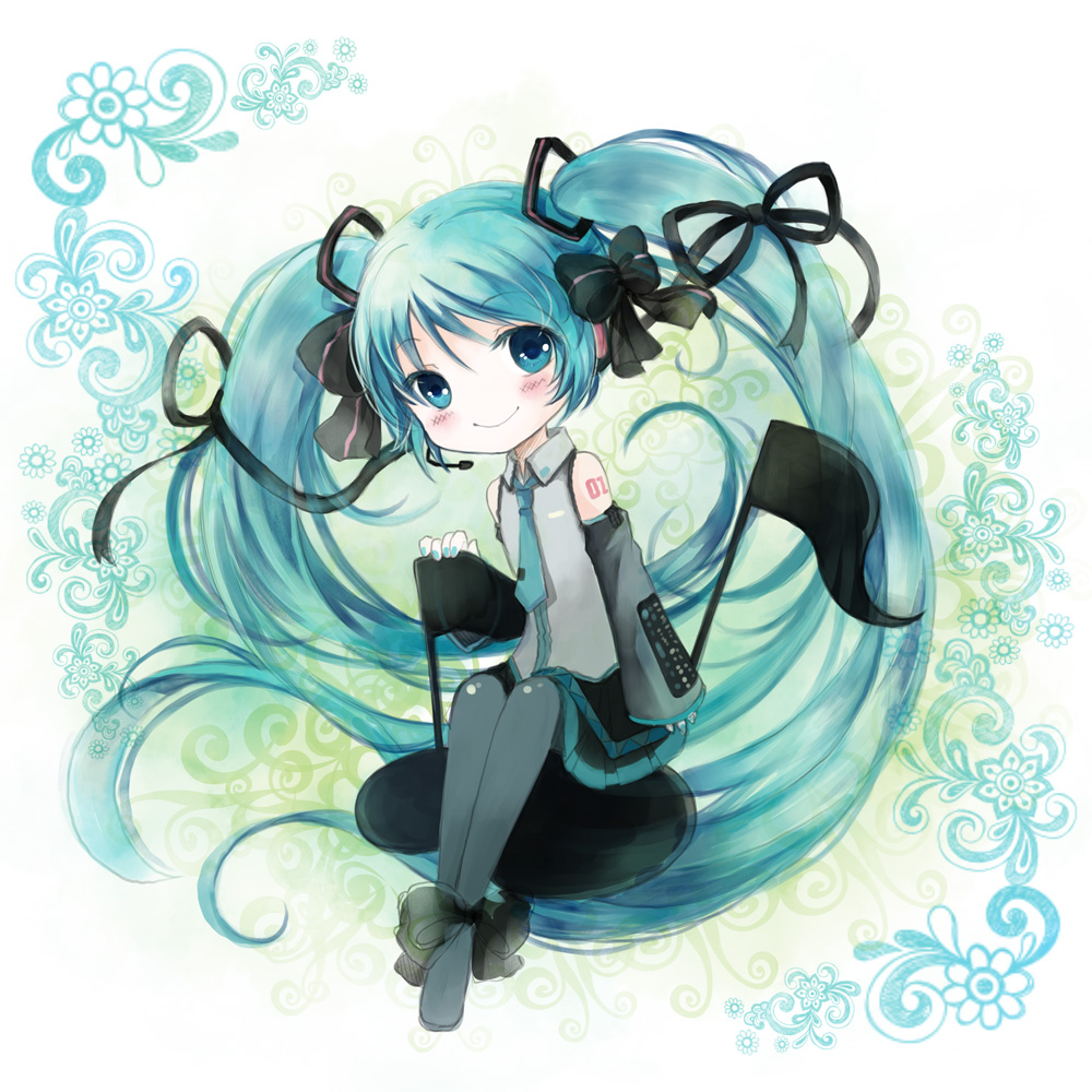 1girlaqua eyesaqua hairdetached sleevesfemale focushair ribbonheadsetlong hairmusical notenecktieno noseribbonskirtsmilesolothighhighstwintailsvery long hair