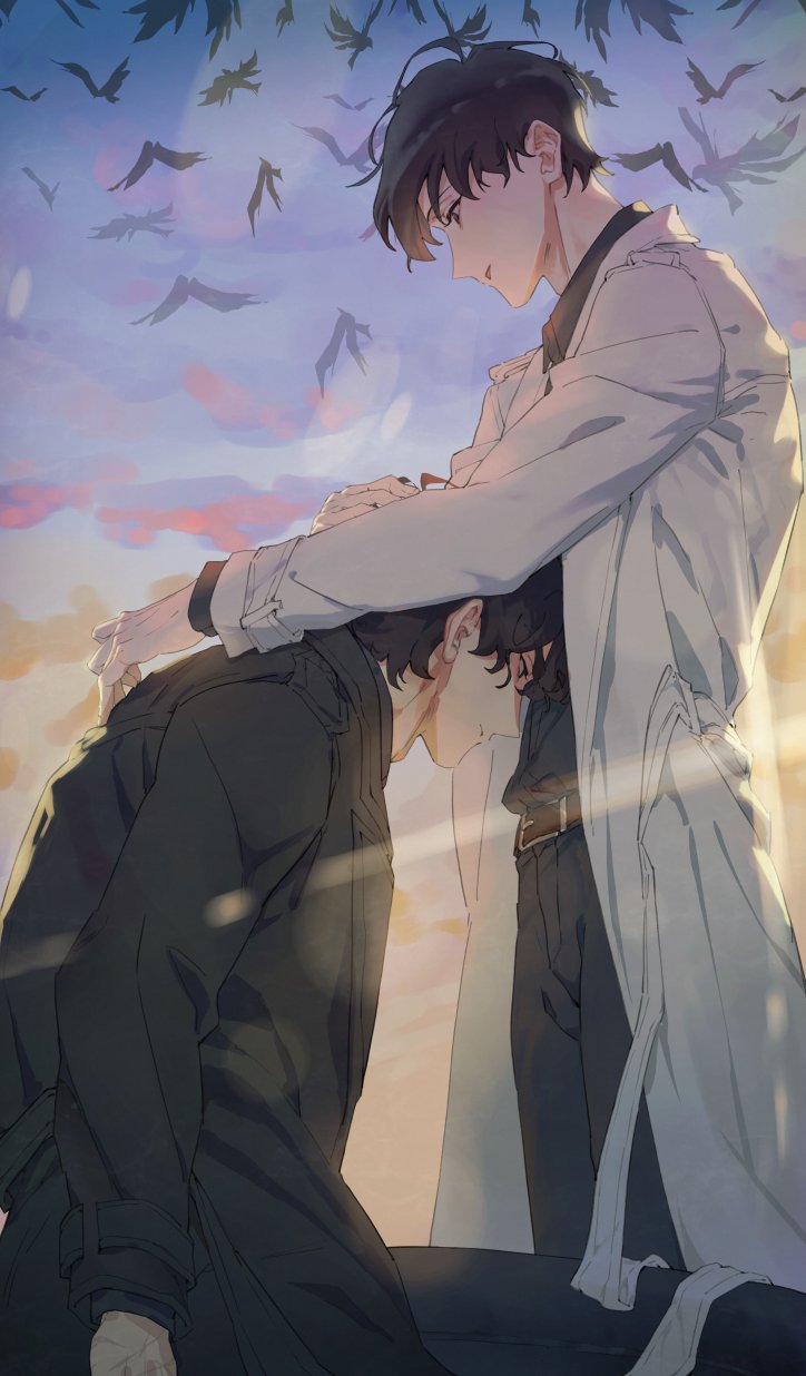 2boysbelt collarblack coatblack hairblack shirtchest beltcoatcollarcollared shirtcurtained hairfellatio gestureflockhand on another's headkneelinglens flaremaking boardmale focusmultiple boysopen clothesopen coatoutdoorspopped collarshirtshirt tucked inshort hairsunsetwhite coatyaoi