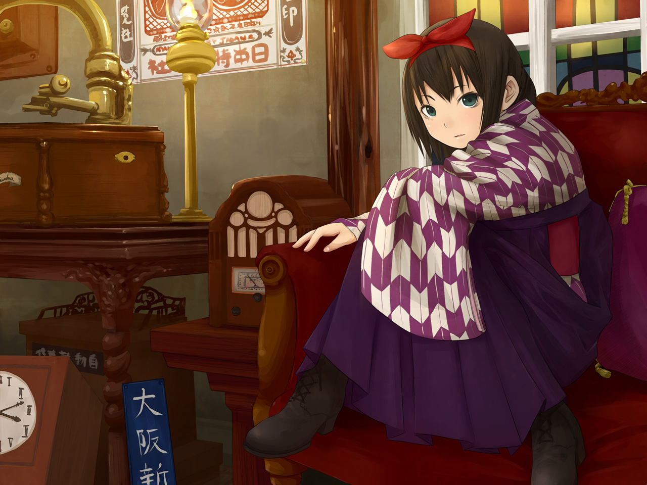 1girlarrow printbootsbrown haircouchfemale focusgreen eyeshakamahakama skirthugging own legsjapanese clotheskimonomeiji schoolgirl uniformradiored upholsteryshort hairsittingskirtsoloyagasuri