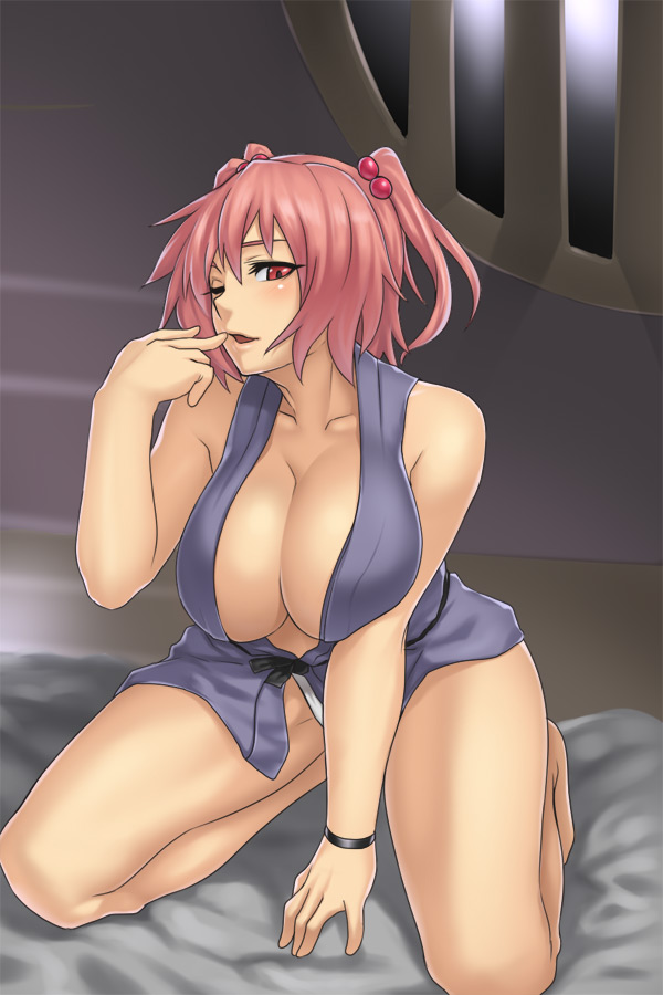 1girlbare shouldersbreastscleavagecollarbonefemale focushuge breastsone eye closedpantiespink hairred eyessolounderwearwink