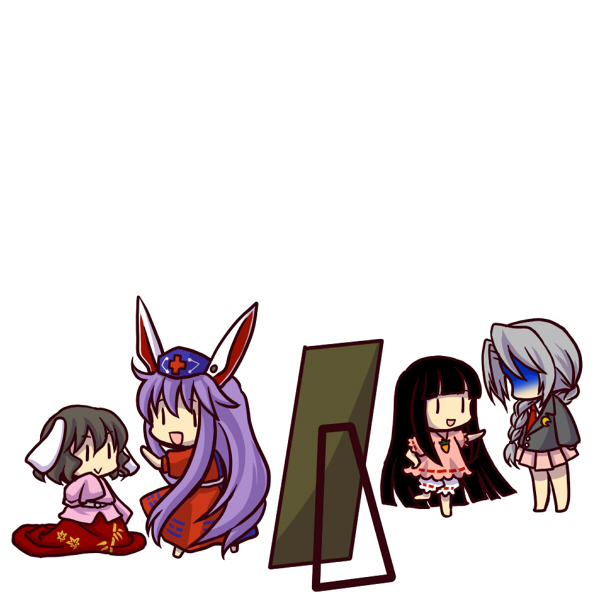1boy4girlsanimal earsblack hairblazerbloomersbraidcarrotchibicosplaycostume switchdressembarrassedfemale focushathouraisan kaguya (cosplay)inaba tewi (cosplay)jacketlong hairmultiple girlsnecktieno eyesopen mouthpleated skirtpurple hairrabbit earsreisen udongein inaba (cosplay)short hairsimple backgroundskirtunderwearvery long hairyagokoro eirin (cosplay)
