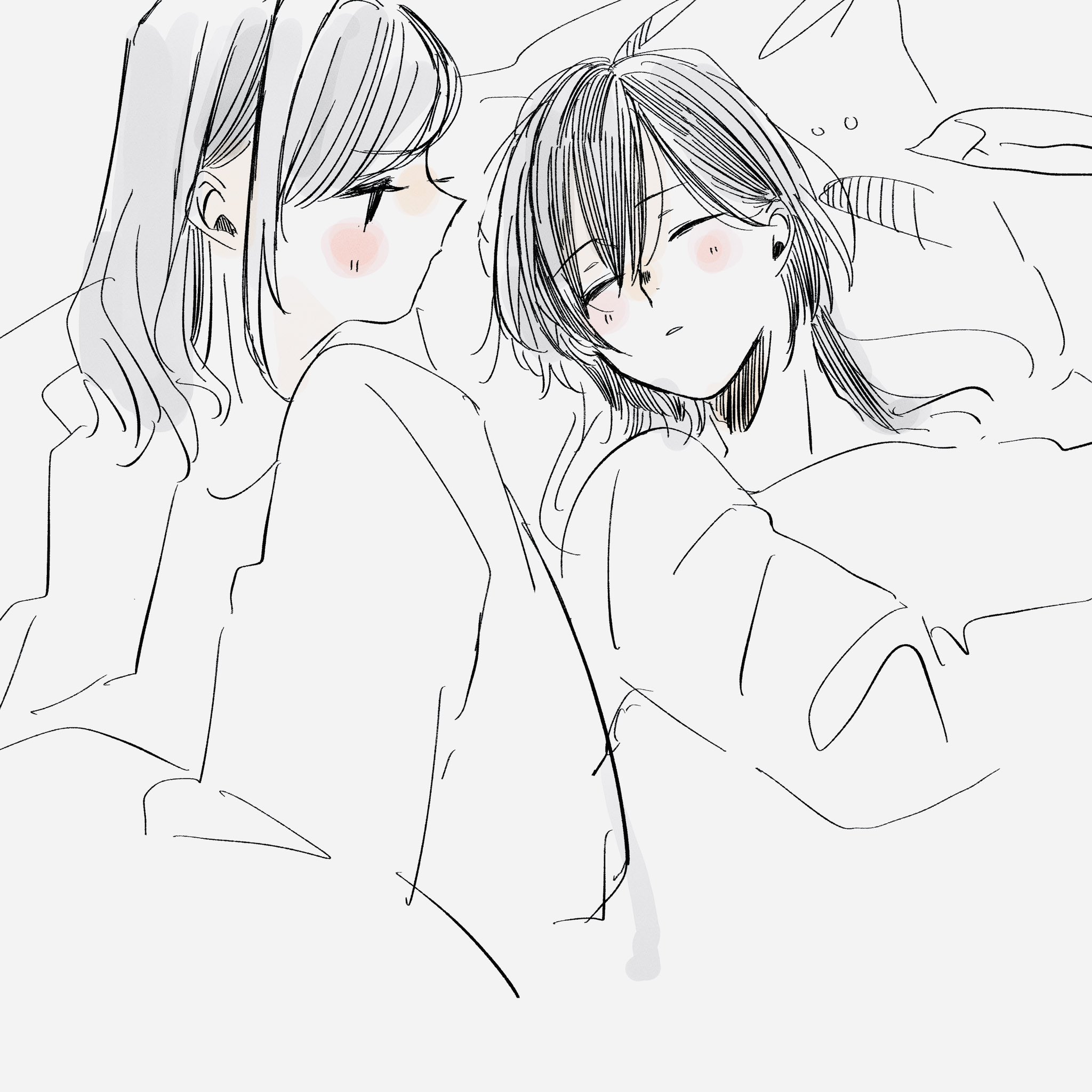 2girlsblushedel notehead on pillowlong hairlong sleeveslooking at anotherlyingmultiple girlson backpillowprofileshirtsketchsleepingsqueansunder coversvirtual youtuber