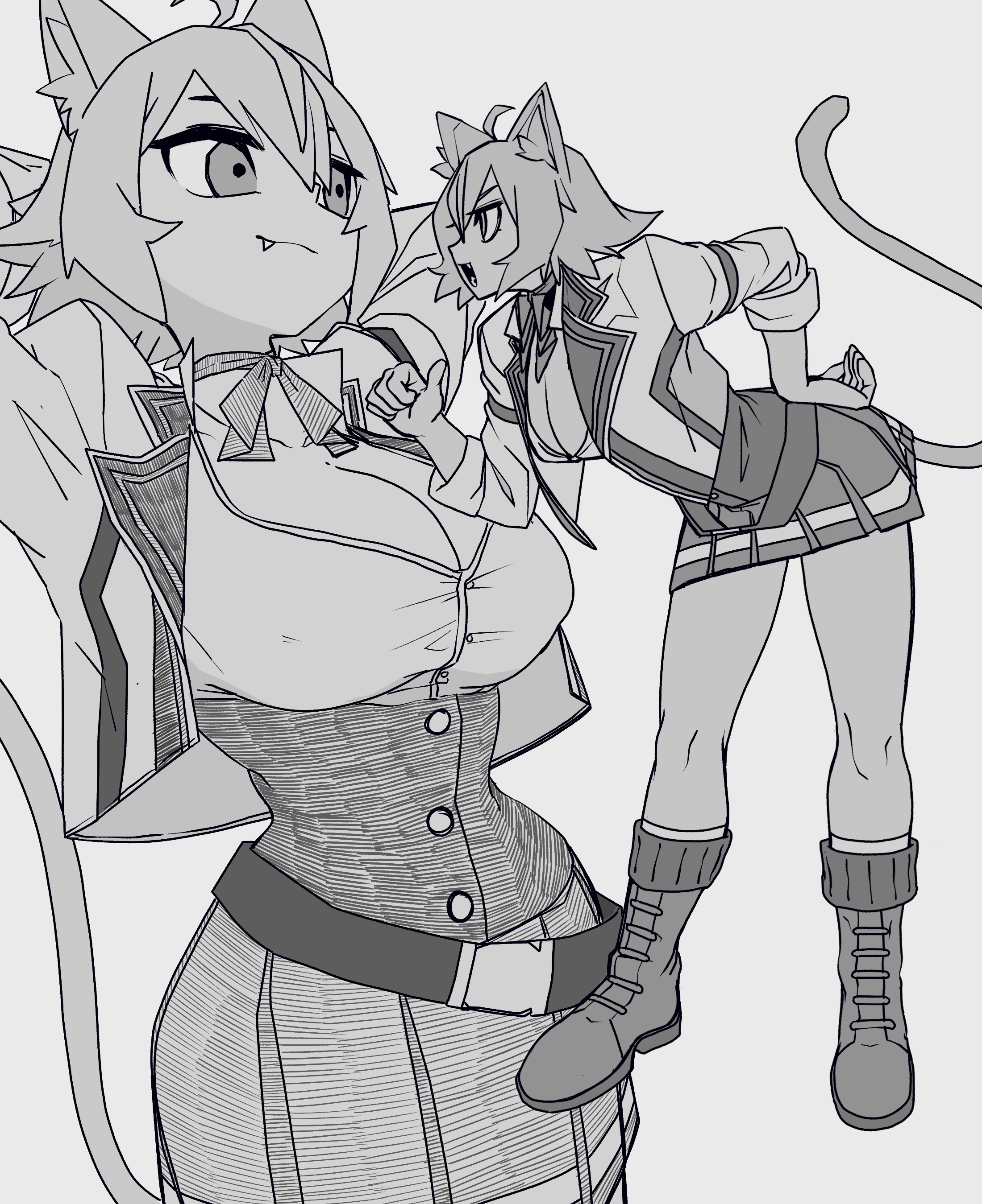 1girlanimal earsbootsbreastscat earscat girlcat tailcleavageclosed mouthdouble-parted bangsfangfang outgreyscalehair between eyeshand on own hiplarge breastsleaning forwardlong sleevesmonochromeopen mouthpleated skirtpointingpointing at selfshort hairsidelockssimple backgroundskirtsolotail