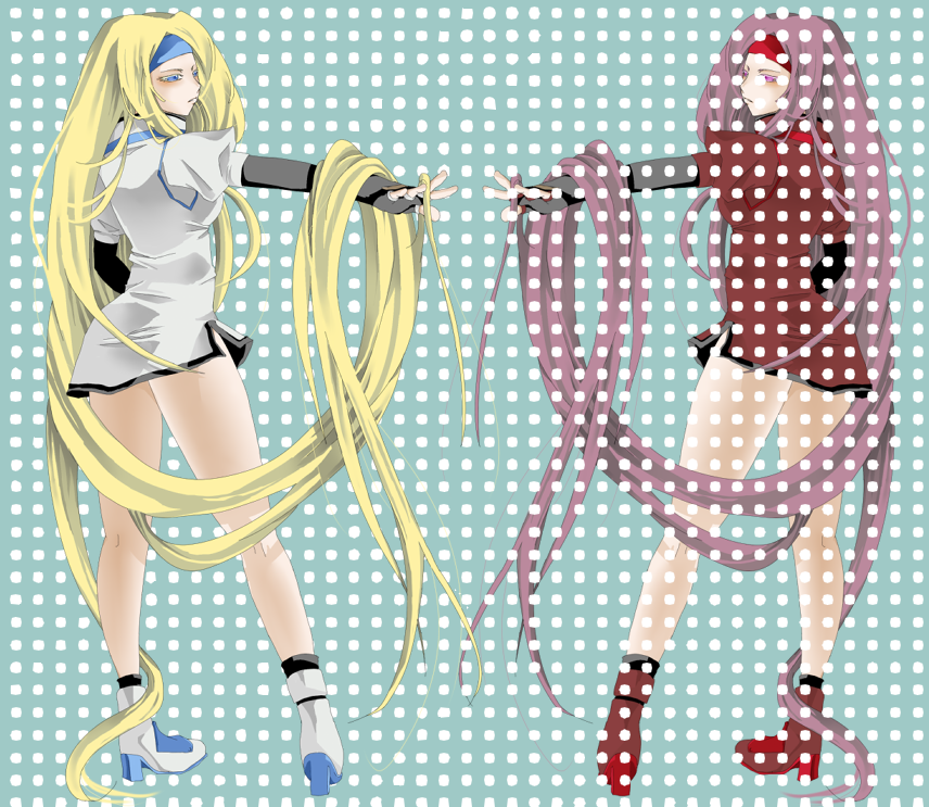 1girlalternate coloralternate hair colorassbackblonde hairblue eyesbottomlesselbow glovesfemale focusfingerless glovesfull bodygloveshairbandheadbandlong hairmultiple viewspurple eyespurple hairstandingvery long hair