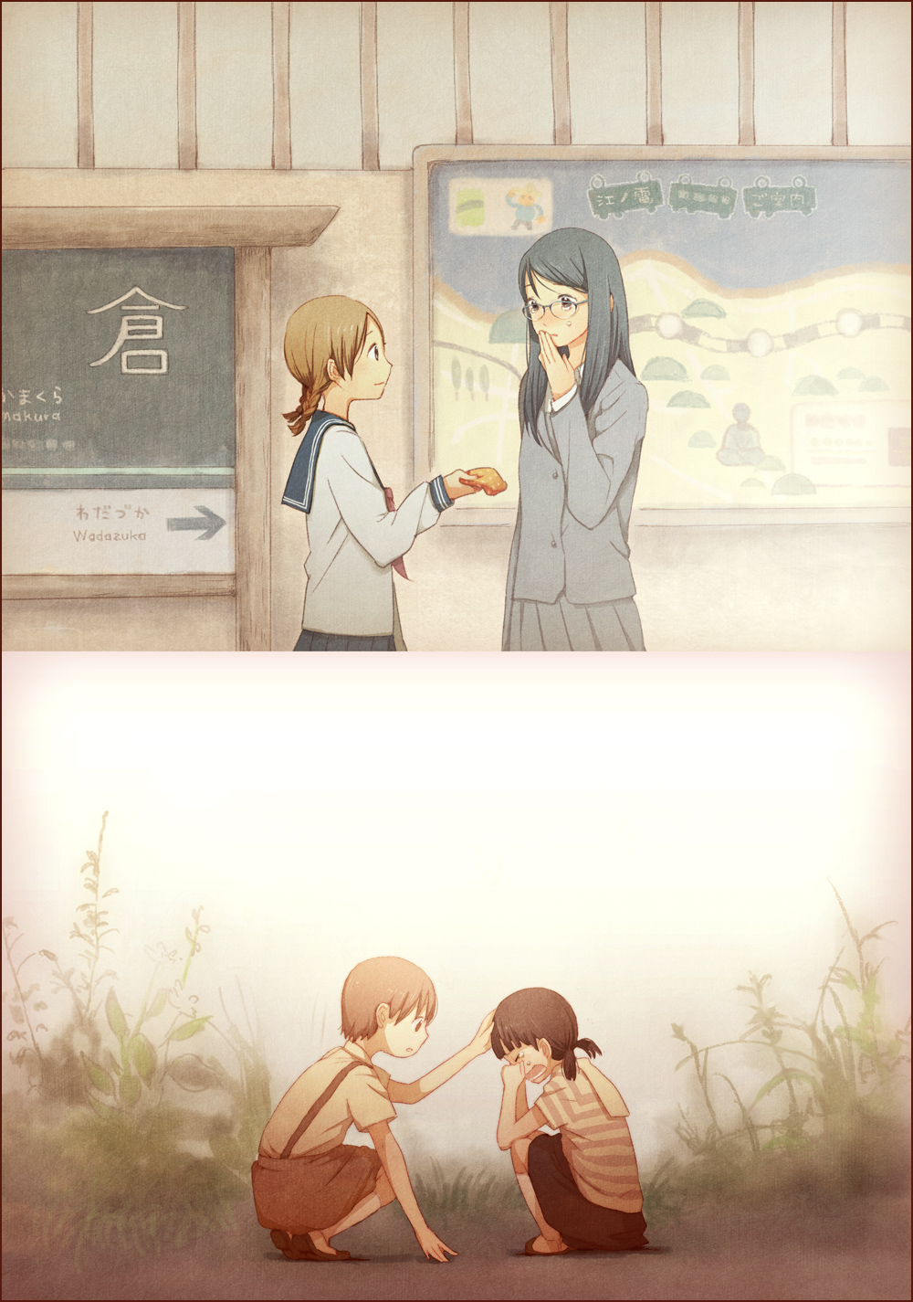 00s2girlsaged downblue hairbraidbrown hairglassesmultiple girlsschool uniformserafukutearstwin braids