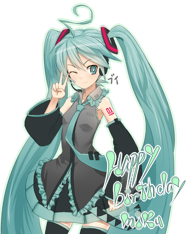 1girlahogeaqua eyesaqua hairbirthdaydetached sleevesfemale focusheadphonesheadsetlong hairnecktieone eye closedsimple backgroundskirtsmilesolothighhighstwintailsvvery long hairwhite backgroundwinkzettai ryouiki