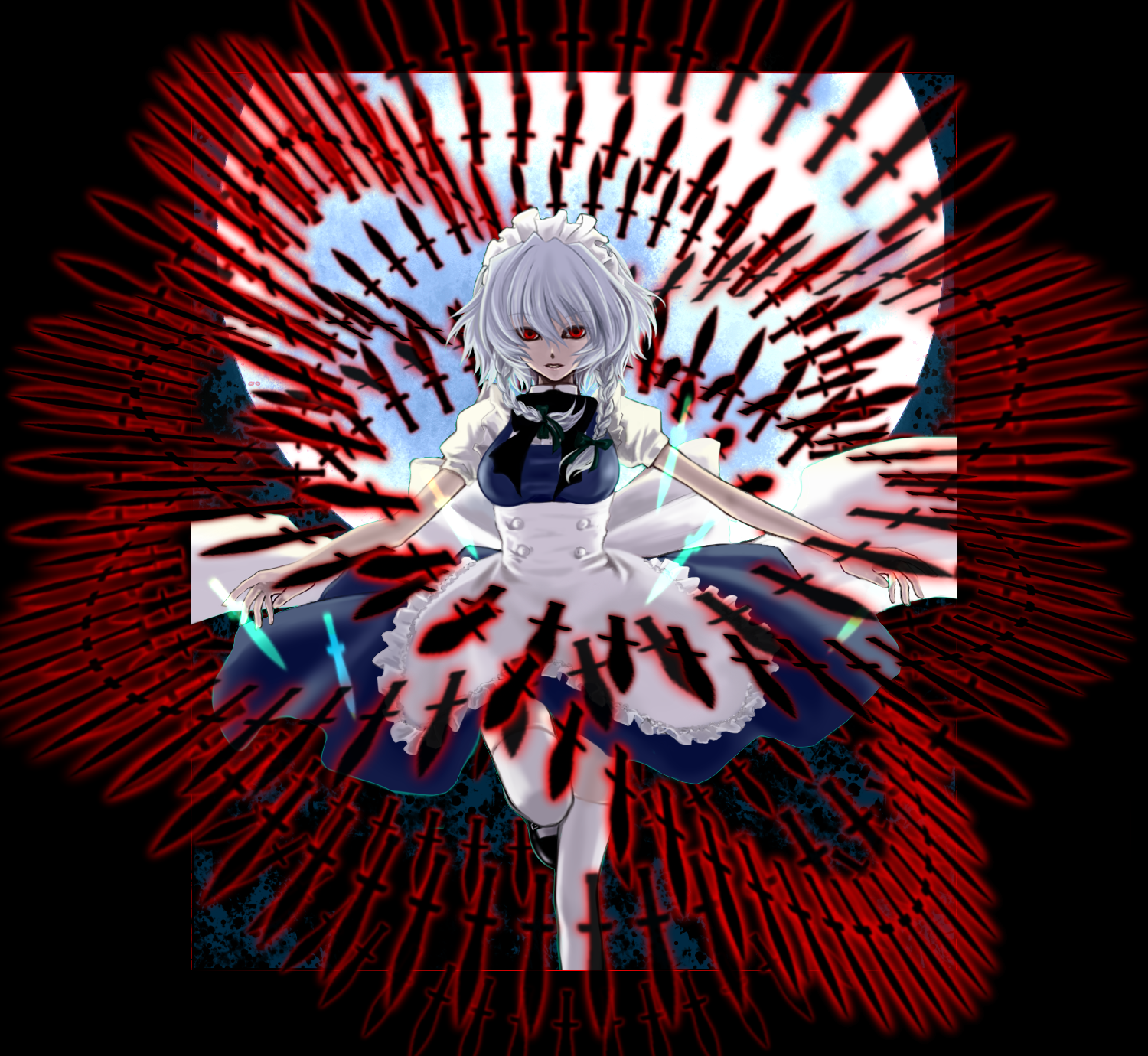 1girlbraidbreastsfemale focusknifemaidoutdoorsred eyesshort hairskysolothighhighsthrowing knifetwin braidsweapon