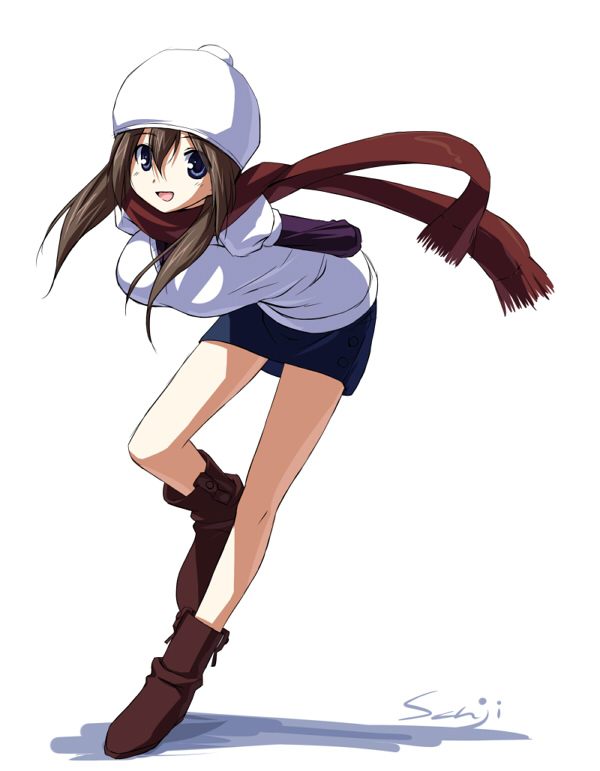 1girlarms behind backbeaniebent overblue eyesbreastsbrown hairfemale focushatlarge breastslegslooking at vieweropen mouthscarfsimple backgroundskirtsolo