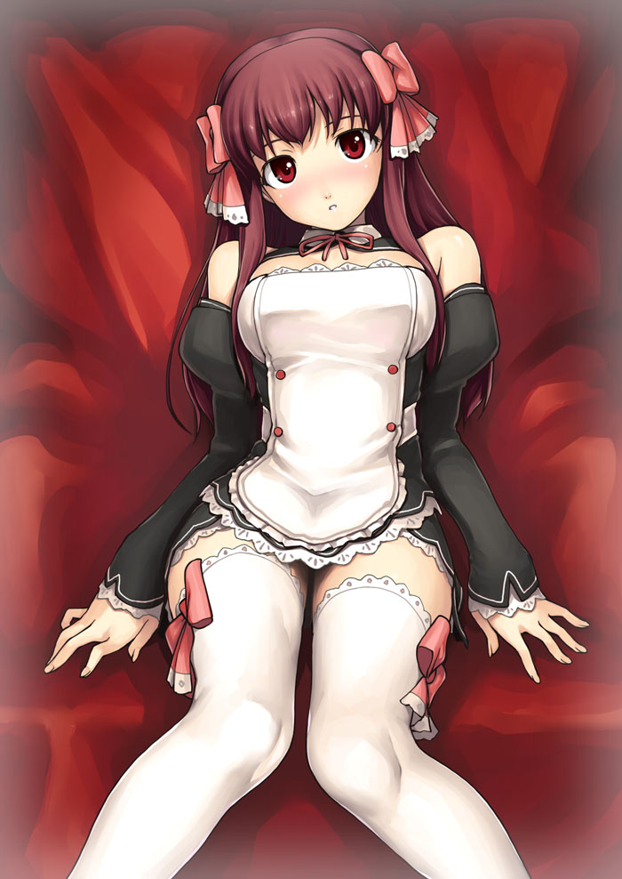 1girlapronblushbowdetached sleevesfemale focushair bowknees together feet apartlooking at viewermaidmaid apronpink hairred eyesred hairsittingsolothighhighs