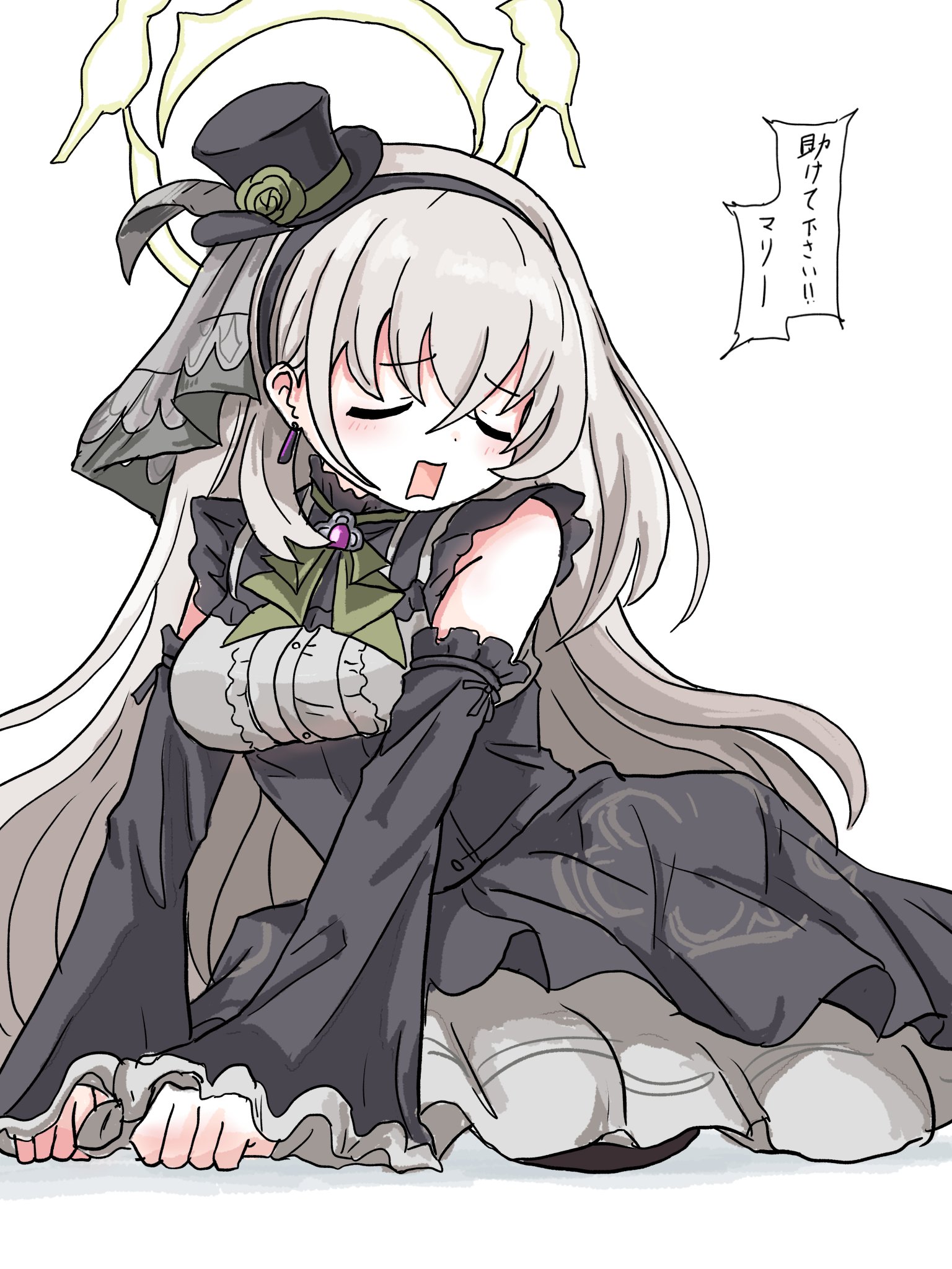 1girlblack dressblack hairbandblack hatblack thighhighsblushclenched handsclosed eyesdetached sleevesdressembarrassedflowerfrilled dressfrilled sleevesfrillsfull bodygreen flowergreen ribbongreen rosegrey dressgrey hairhairbandhalohands on floorhathat floweridolidol clotheslayered dresslong hairlyingmini hatmini top hatofficial alternate costumeon flooropen mouthrectangular mouthribbonrosesittingsleevelesssleeveless dresssolospeech bubblethighhighstop hatvery long hairwhite backgroundyellow haloyokozuwari