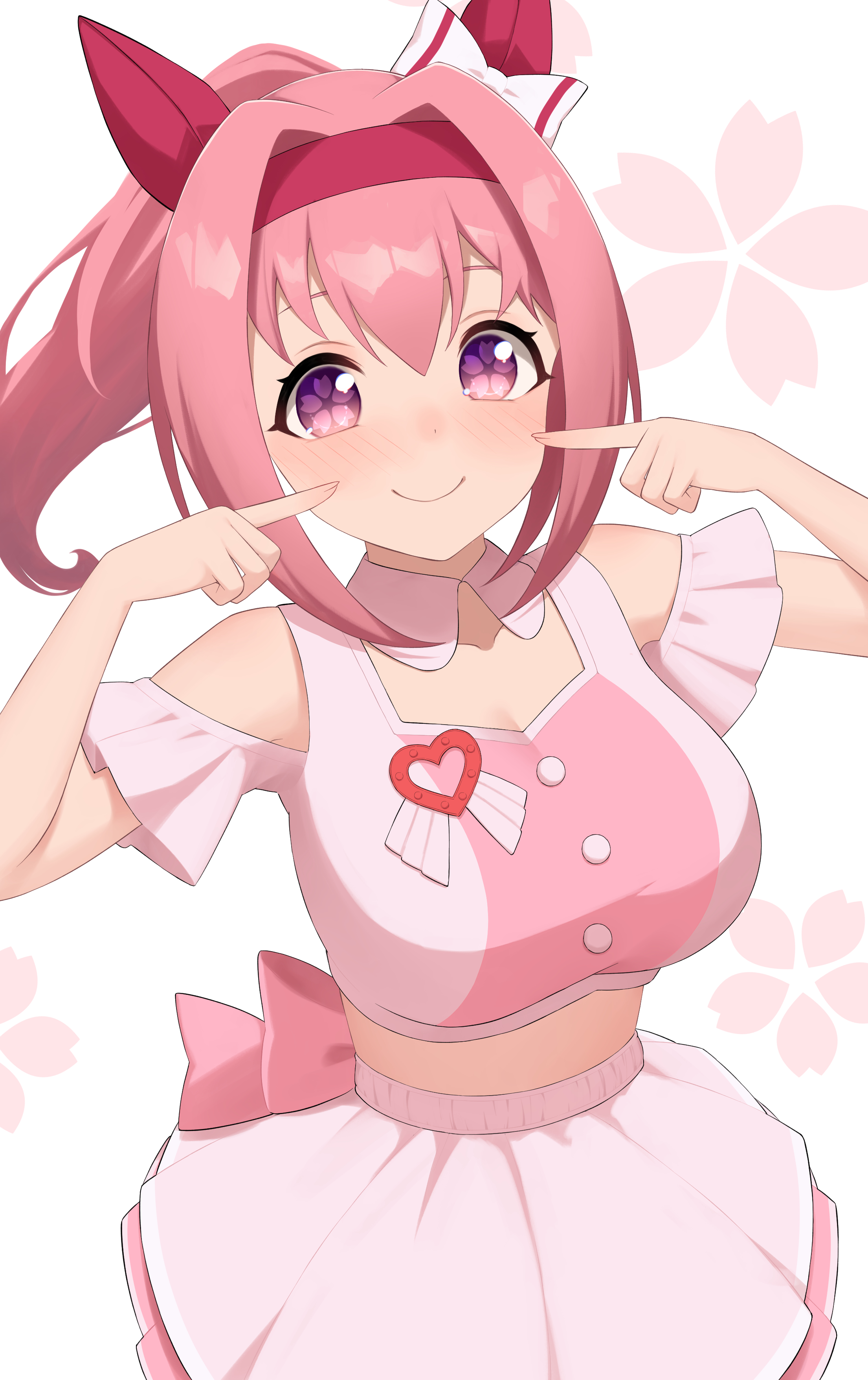 1girlalternate breast size (larger)animal earsblushbreastsclosed mouthear covershairbandhorse earshorse girllarge breastslooking at viewermeni shuki rush-sshu!midriffpink hairpink skirtpurple eyesred hairbandskirtsmilesolo