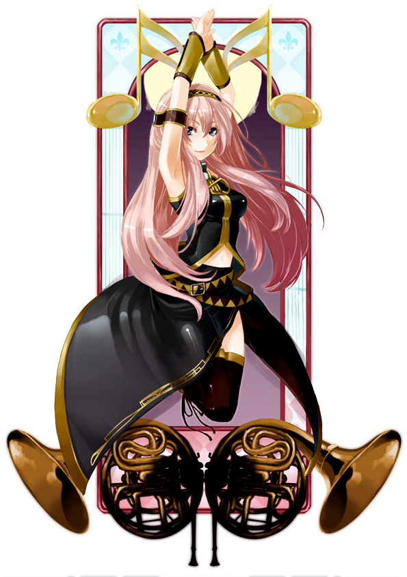1girlarms upblue eyesfemale focusfrench hornheadphonesinstrumentjumpinglong hairmusical notenavelpink hairskirtsolosousaphonethighhighsvery long hair