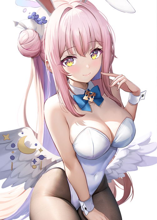 1girlanimal earsbare shouldersblushbowbowtiebreastsbrown pantyhosecleavagecovered naveldetached collarfake animal earsfeathered wingsflowerhair bunhair flowerhair ornamenthair scrunchiehalohighleghighleg leotardlarge breastsleotardlong hairlooking at viewerpantyhosepink hairplayboy bunnyrabbit earsscrunchiesidelockssingle side bunsmilesolowhite leotardwingswrist cuffsyellow eyes