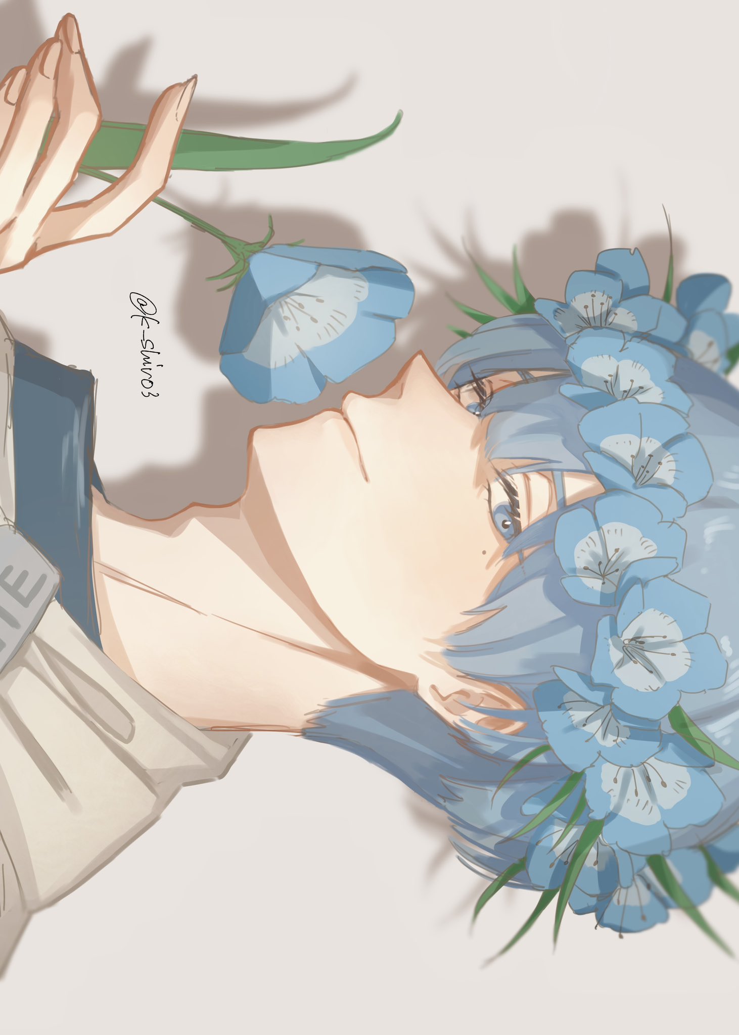 1boyadam's appleblue eyesblue flowerblue hairclosed mouthdrop shadoweyelashesflowerflower to mouthflower wreathgrey backgroundhand upholdingholding flowerleaflight smilelooking to the sidemale focusnemophila (flower)plantshort hairsidewayssideways glancesimple backgroundsolotwitter username