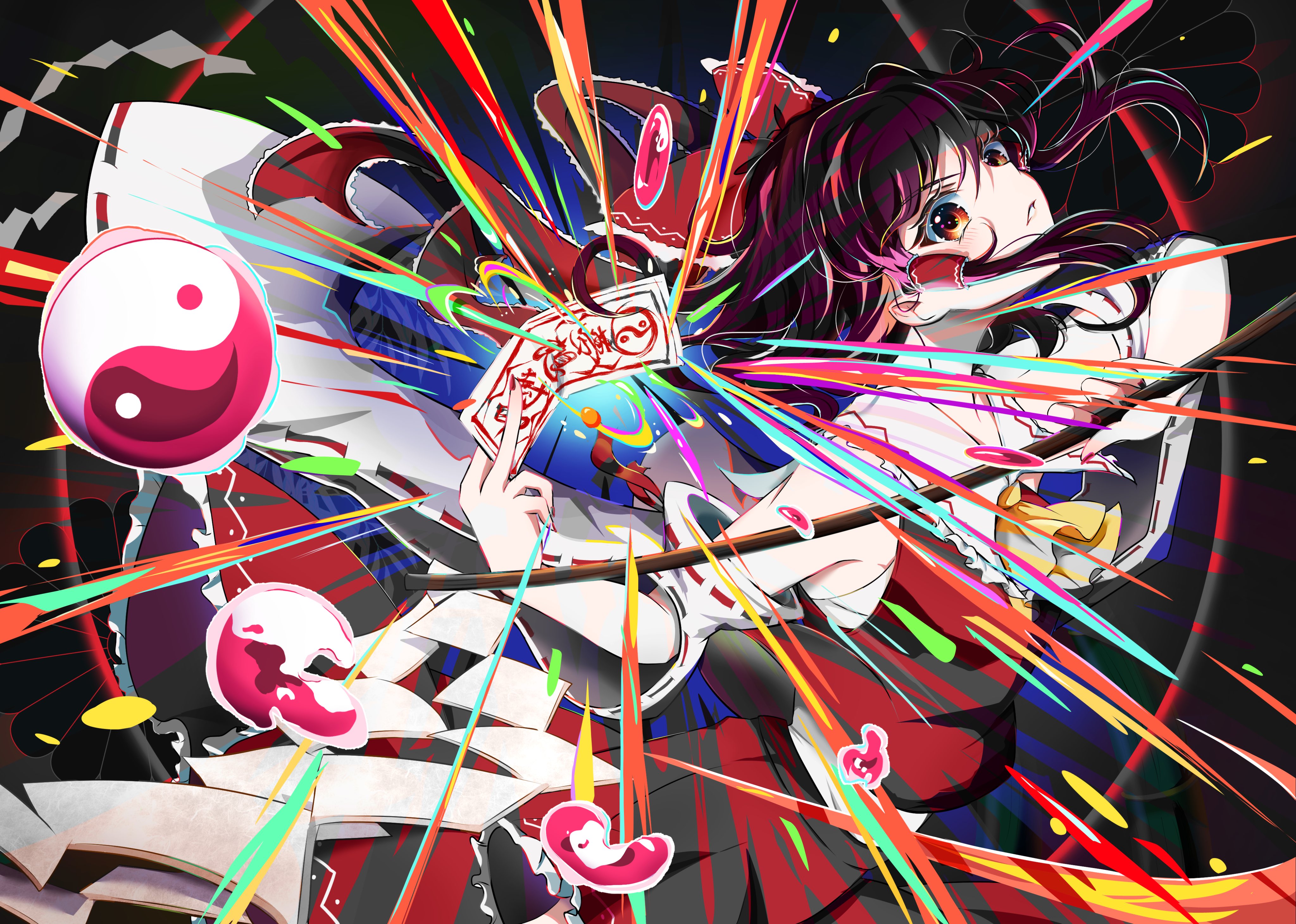 1girlascotbare shouldersblack hairbowbrown eyesdetached sleevesfrilled bowfrillsgoheihair bowhair tubesholdingholding goheiholding ofudamedium hairofudaorbparted lipsred bowred shirtred skirtribbon trimribbon-trimmed sleevesshirtskirtsleevelesssleeveless shirtsolowide sleevesyellow ascotyin yangyin yang orb