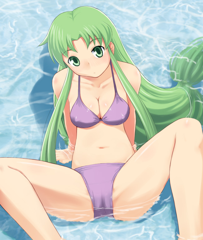 1girlbikiniblushbreastscameltoecovered erect nipplesfemale focusgreen eyesgreen hairmatching hair/eyesmedium breastspurple bikinisolospread legsswimsuitwater