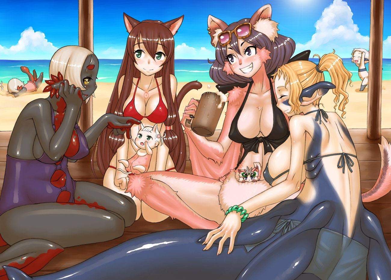 6+girlsage differenceanimal earsbabybeachbikiniblue skybreastscat earscat girlcleavageclouddolphinfamilyfemale focusgrinhappyhuge breastslarge breastslong hairmature femalemonster girlmother and daughtermultiple girlsoceanoutdoorsplumpshort hairsittingskysmilesunglassesswimsuit