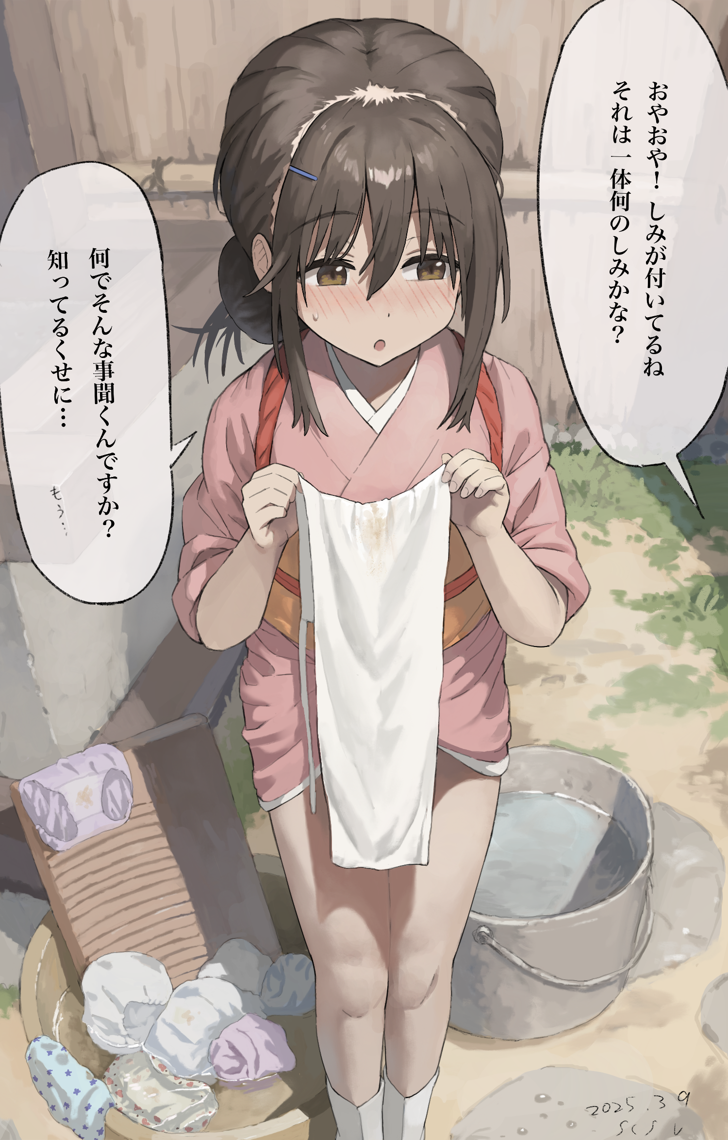 :o1girlaverting eyesblushbrown eyesbrown hairbucketdatedembarrassedfacing viewerfeet out of framefundoshihair between eyeshands upheartheart pantiesheart printholdingholding unworn clothesjapanese clotheskimonolong bangslong hairpantiesparted lipspee stainpink kimonoprint pantiessidelockssolospeech bubblestained pantiesstandingstar (symbol)star pantiesstar printunderwearunworn pantieswater