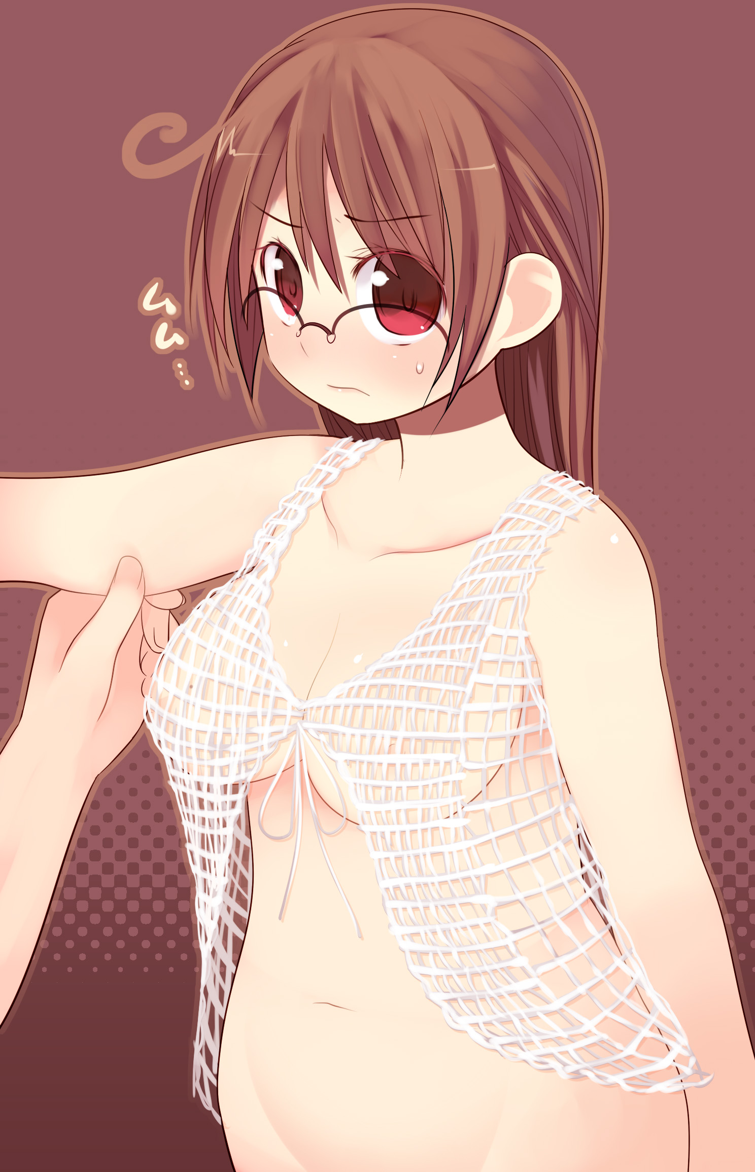 1girlahogeblushbreastsbrown hairfishnet topfishnetsglasseslingerielong hairmolemole on breastnavelnegligeenipplespinchingred eyessolo focustaremeunderwear