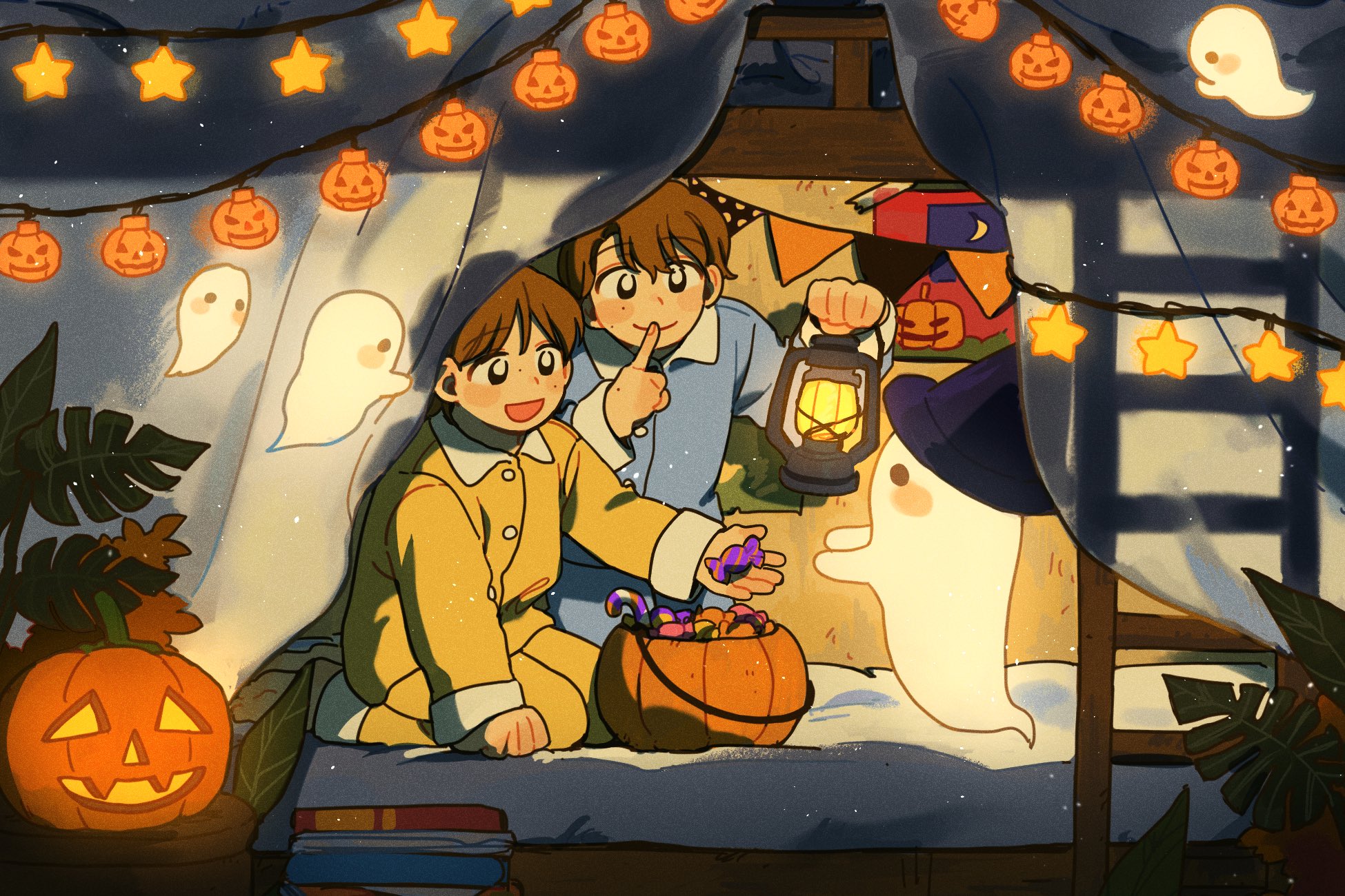 1boy1girlbasketbedblack eyesblue pajamasblue pantsbrown hairbunk bedcandycollared pajamasfoodghosthalloweenholdingholding candyholding foodholding lanternindex finger raisedladderlanternlong sleeveson bedpajamaspantsseizashort hairsittingyellow pajamasyellow pants