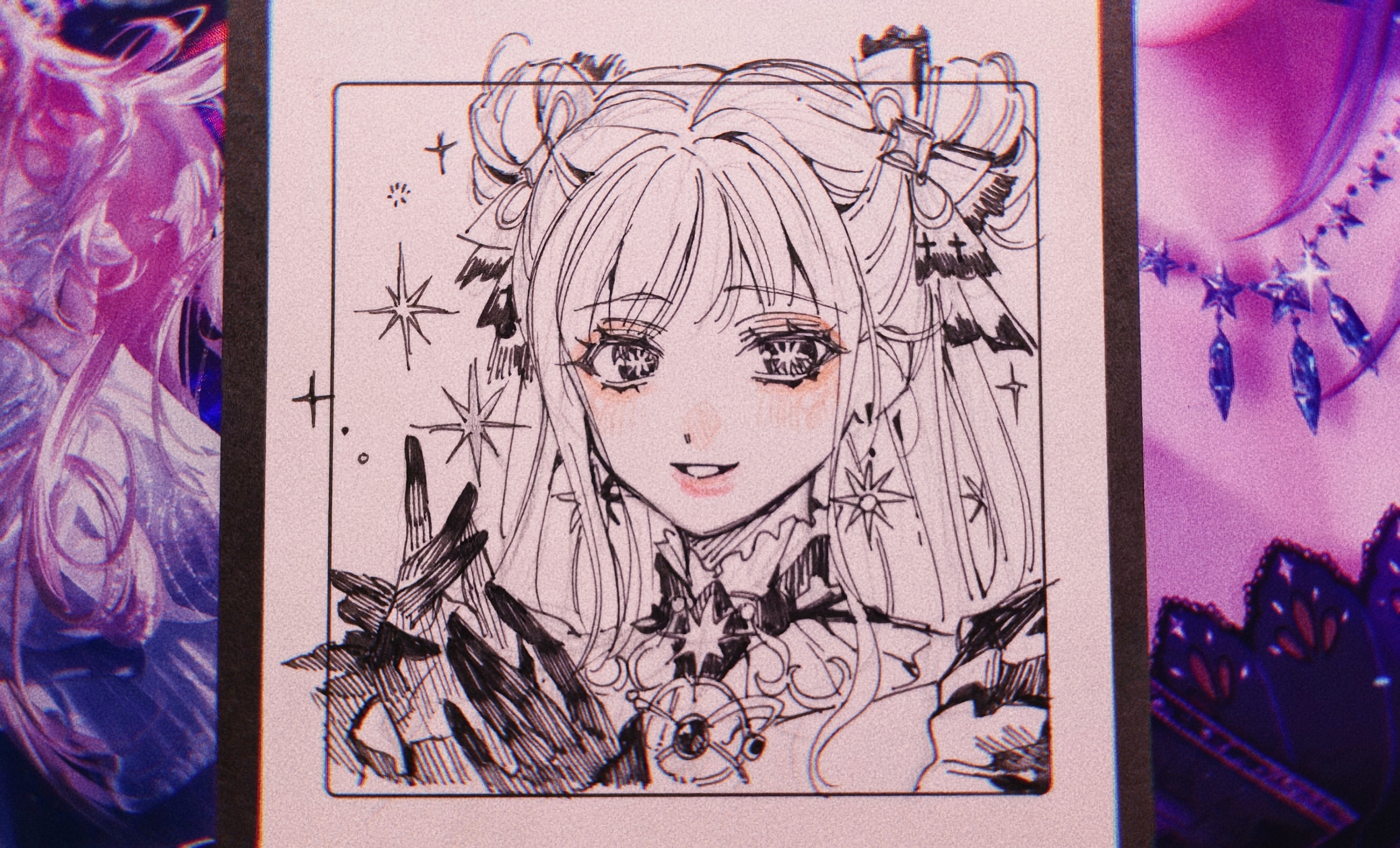 1girlbowchokercrosscross printdot nosedouble bundresseyelasheseyeshadowfour-pointed starfrilled chokerfrilled dressfrilled wrist cuffsfrillsgame screenshot insetglovesgreyscalehair bowhair bunhair ornamenthair ribbonhexagramlight blushlipsticklong hairlooking at viewermakeupmeyyomonochromeoutside borderown hands togetherparted lipspink lipsprint bowribbonsidelockssmilesolosparklespot colorstar (symbol)star chokerstar hair ornamentstar-shaped pupilssymbol-shaped pupilsteethupper bodyvery long hairwavy hairwrist cuffs