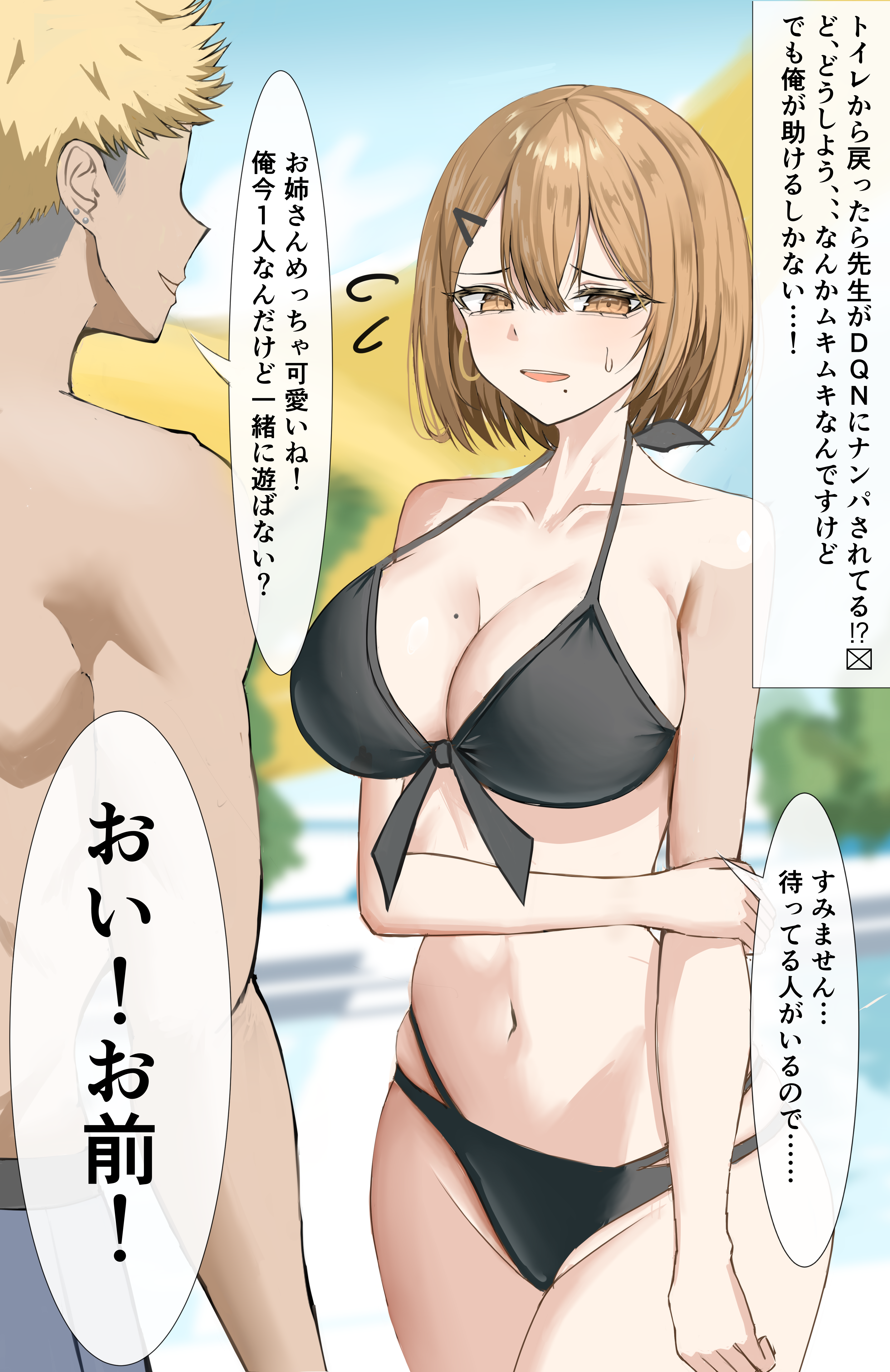 1boy1girlarm under breastsbare shouldersbikiniblack bikiniblonde hairblue skybob cutbreastsbrown eyesbrown haircleavagecollarbonedark skindark-skinned maleearringsfade (haircut)flirtinghair between eyeshair ornamenthaircliphoop earringsjewelrylarge breastslooking at viewermale swimwearmolemole on breastmole under mouthmuscularmuscular malenavelnecklaceopen mouthoutdoorspoolsideshort hairskindentationskysmilespeech bubblesweatdropswim trunksswimsuitwide hips