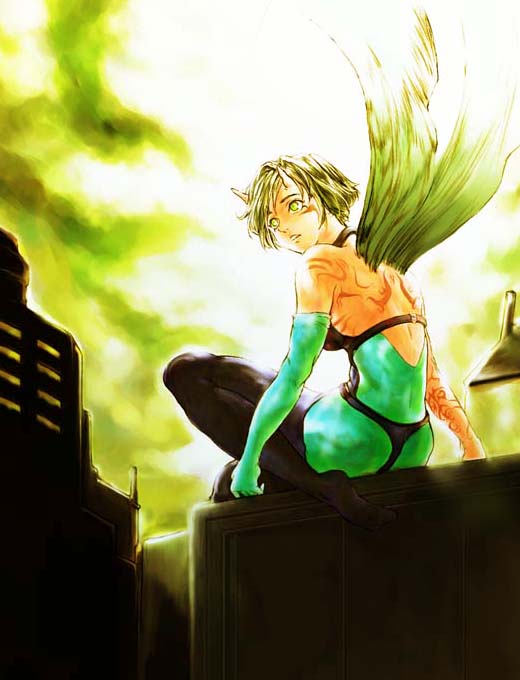 1girlbackback tattooblonde haircityelbow glovesfemale focusfrom behindgloveshornsmonster girloutdoorsshort hairsittingskysolotattoowingsyellow eyes