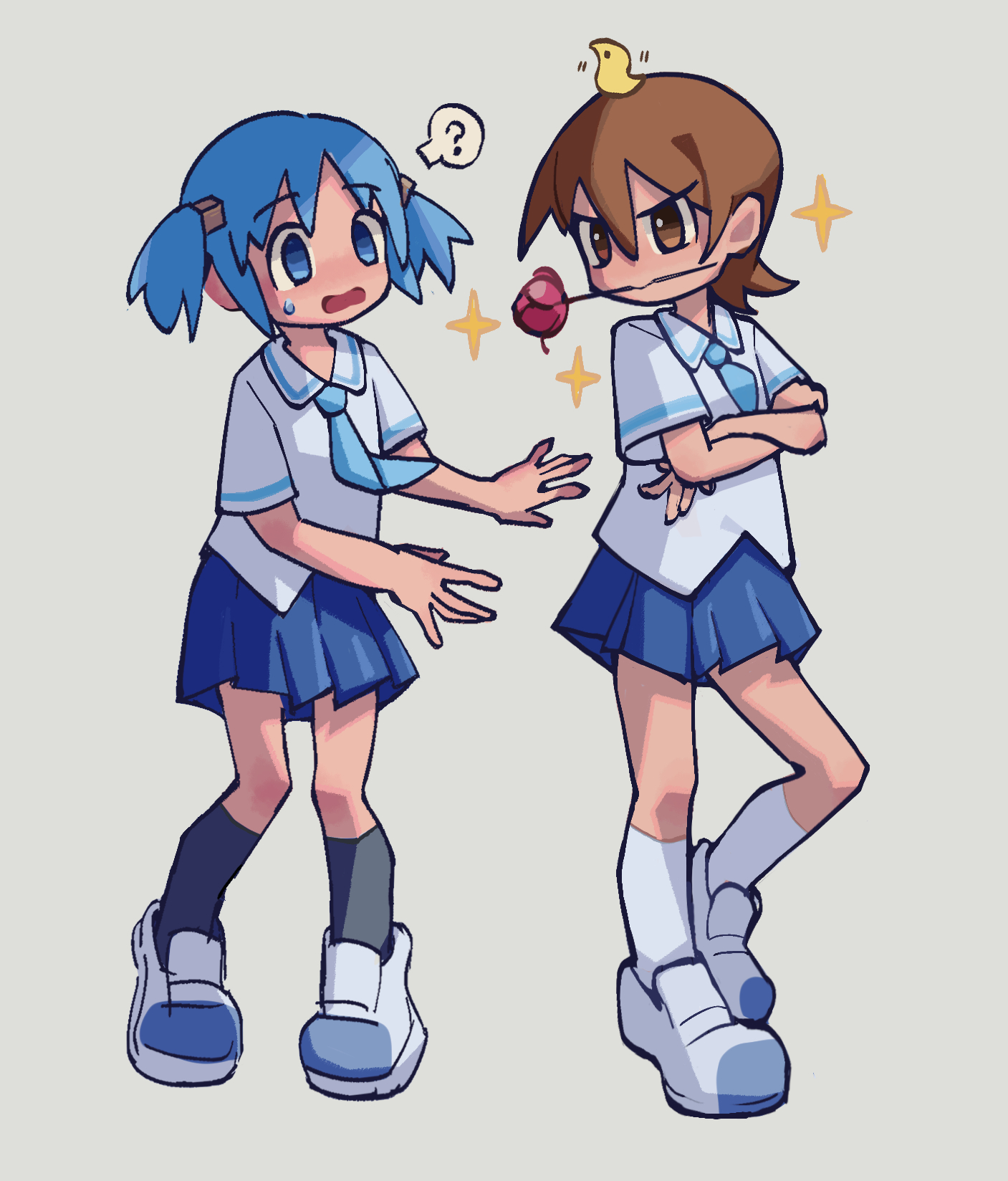 1boy2girlsblack socksblue eyesblue hairblue necktieblue skirtbrown eyesbrown hairclosed mouthcollared shirtcube hair ornamentdouble-parted bangsflowerflower in mouthgrey backgroundhair between eyeshair ornamentlooking at anothermultiple girlsnecktieopen mouthpleated skirtred flowerred roseroseschool uniformshirtshoesshort hairshort sleevesshort twintailssimple backgroundskirtsockssparklespeech bubblespoken question marksweatdroptokisadame school uniformtwintailswhite shirtwhite shoeswhite socks