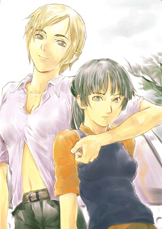 2girlsbeltblack eyesblack hairblonde hairbreastscleavagecollarbonedress shirtmultiple girlsnavelopen clothesopen shirtponytailraglan sleevesshirtshort hairsweater vest