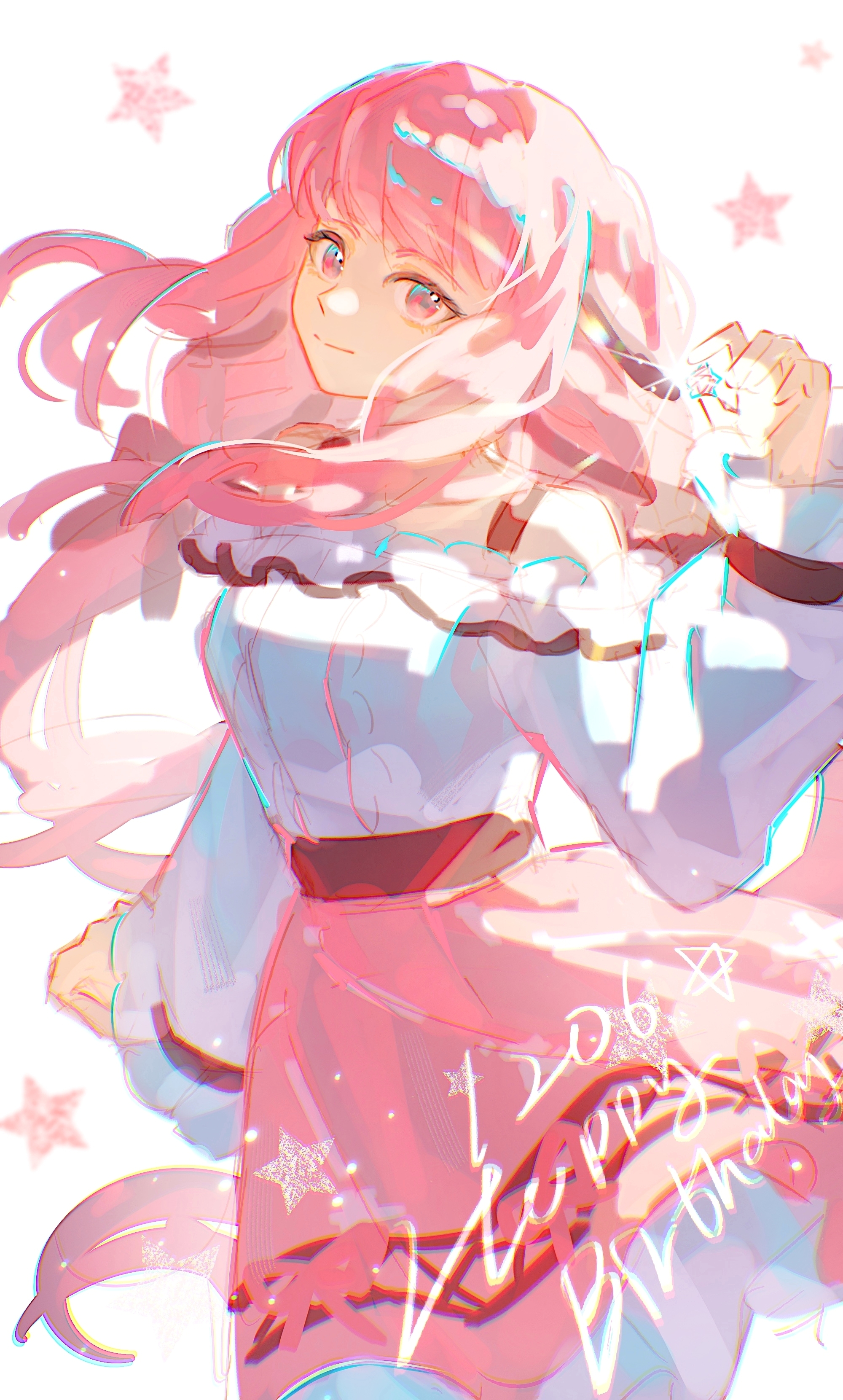 1girlbare shouldersblack bowblack ribbonbowbra strapcenter frillschalkboardclosed mouthcowboy shotdatedfloating clothesfloating hairfrilled shirtfrilled skirtfrilled sleevesfrillshair bowhair ribbonhappyhappy birthdayhead tiltholdingholding starlight particleslong hairlong sidelockslong sleeveslooking at viewerlow twintailsminiskirtoff shoulderoff-shoulder shirtpink eyespink hairpink skirtpointy noseprint skirtpuffy long sleevespuffy sleevesribbonshirtsidelocksskirtsmilesnowflake printsolostandingstar (sky)star (symbol)star symbol backgroundtress ribbontwintailsvery long hairwavy hairwhite backgroundwhite shirt