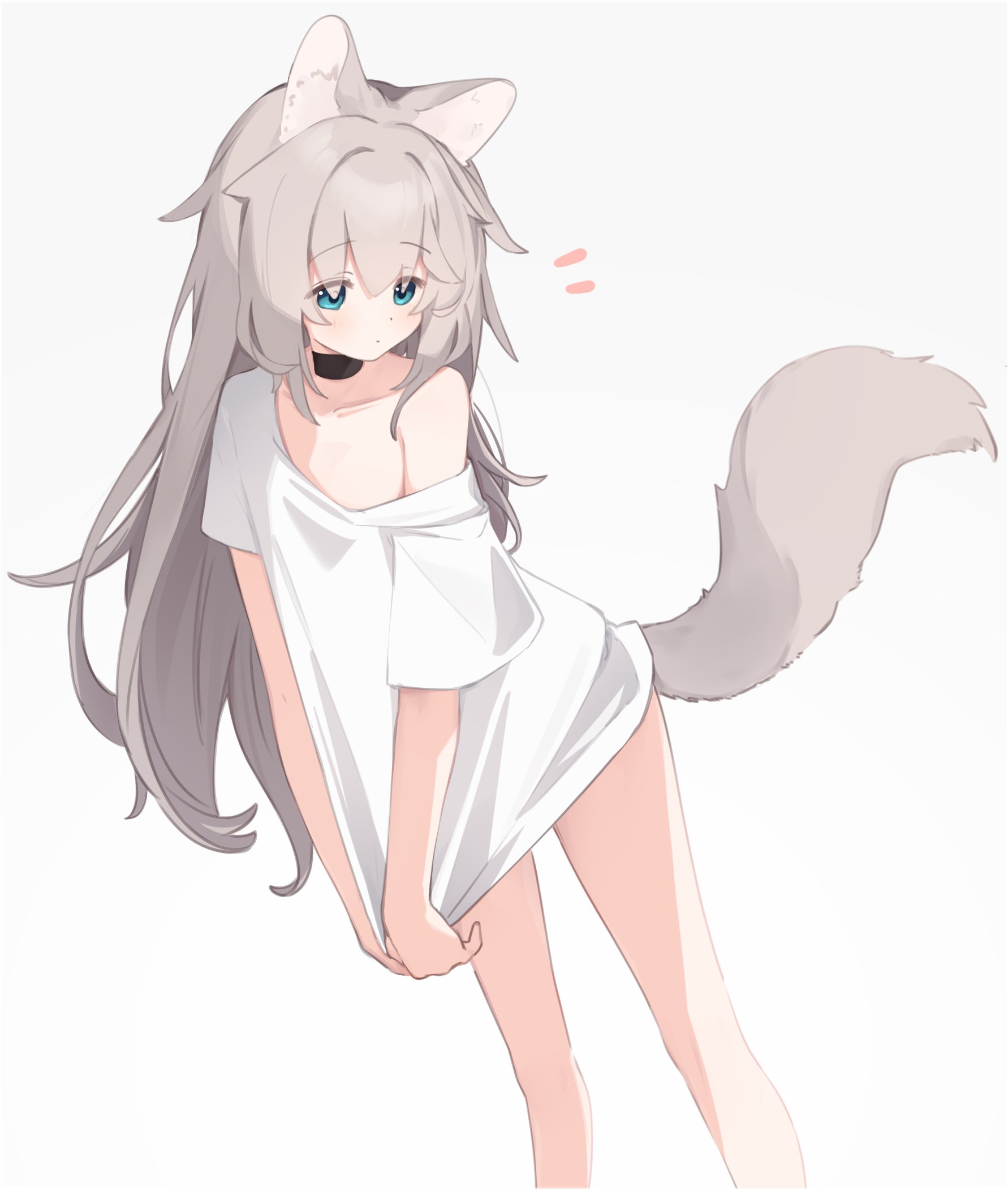 1girlanimal ear fluffanimal earsbare shouldersblack chokerblue eyeschokerclosed mouthcollarbonegrey backgroundgrey hairhair between eyeslong hairnotice linesoff shouldershirtshirt tugshort sleevessimple backgroundtailvery long hairwhite shirt