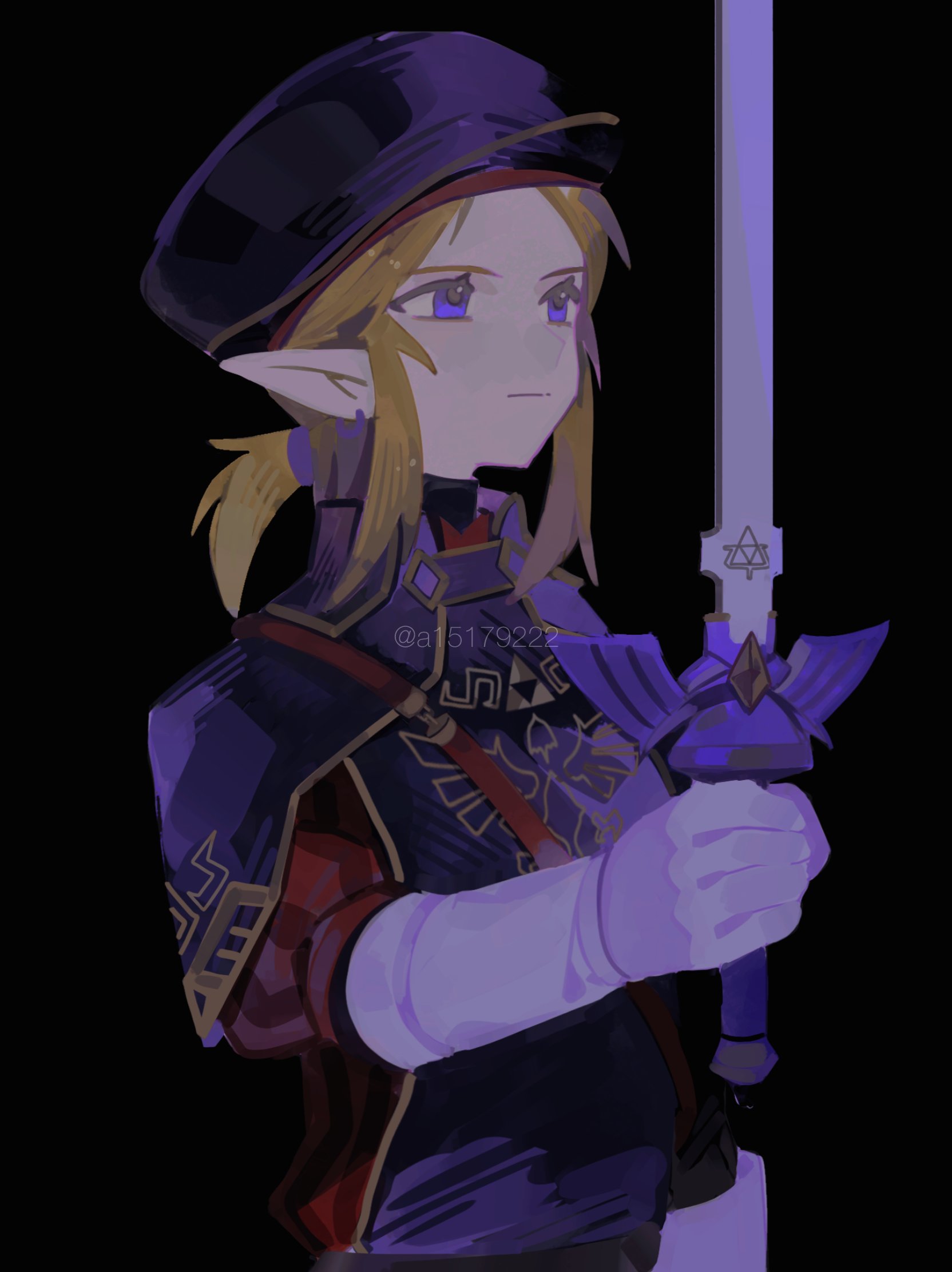 1boyberetblack backgroundblue eyesblue hatclosed mouthglovesgold trimhair tiehatholdingholding swordholding weaponlow ponytailmale focusmaster swordmilitary hatmilitary uniformofficial alternate costumeparted bangspointy earsponytailroyal guard set (zelda)sidelockssoloswordtwitter usernameweaponwhite gloves
