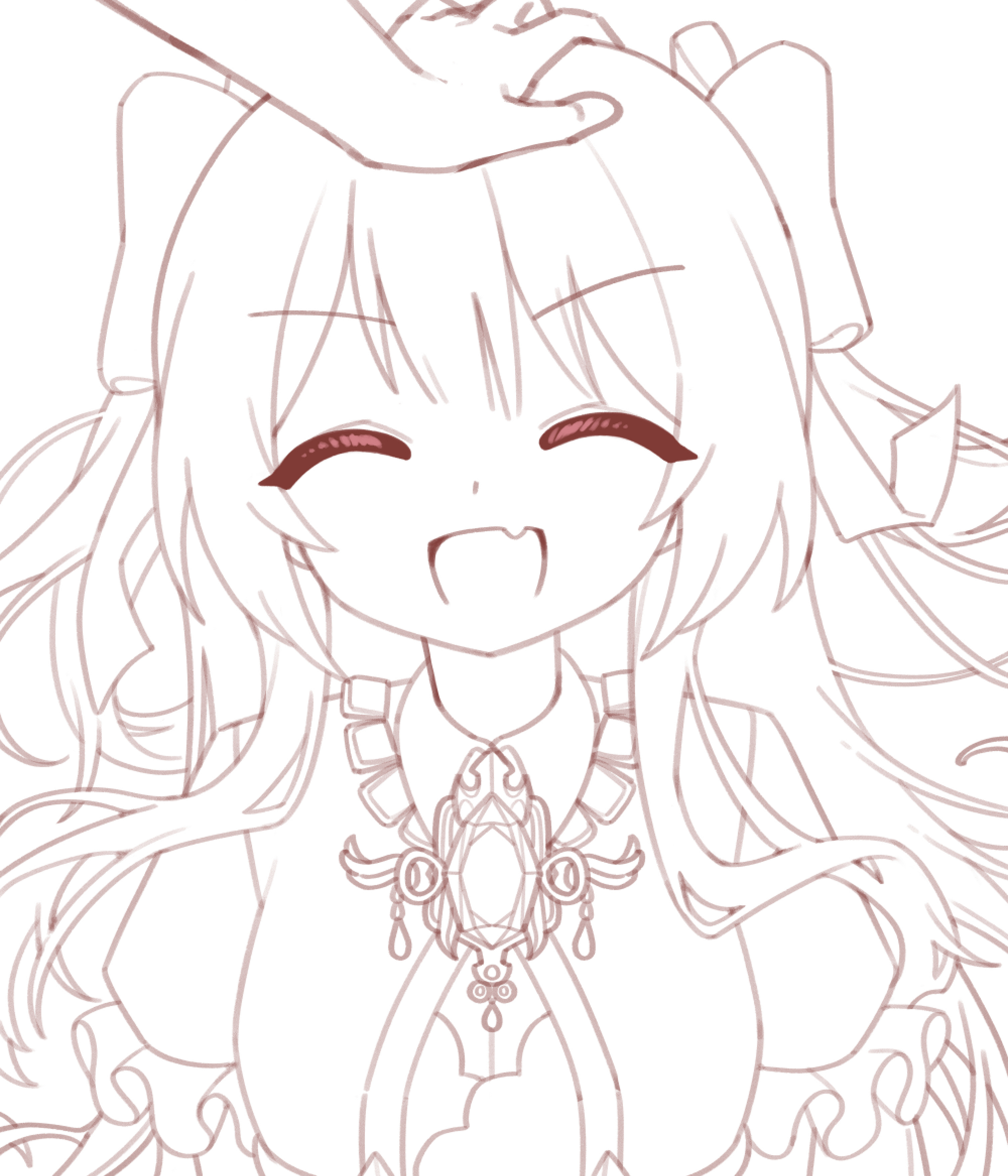 1girlbreastscleavage cutoutclosed eyesclothing cutoutfacing viewerfanghair ribbonheadpatlong hairopen mouthribbonskin fangsmilesolo focusupper body