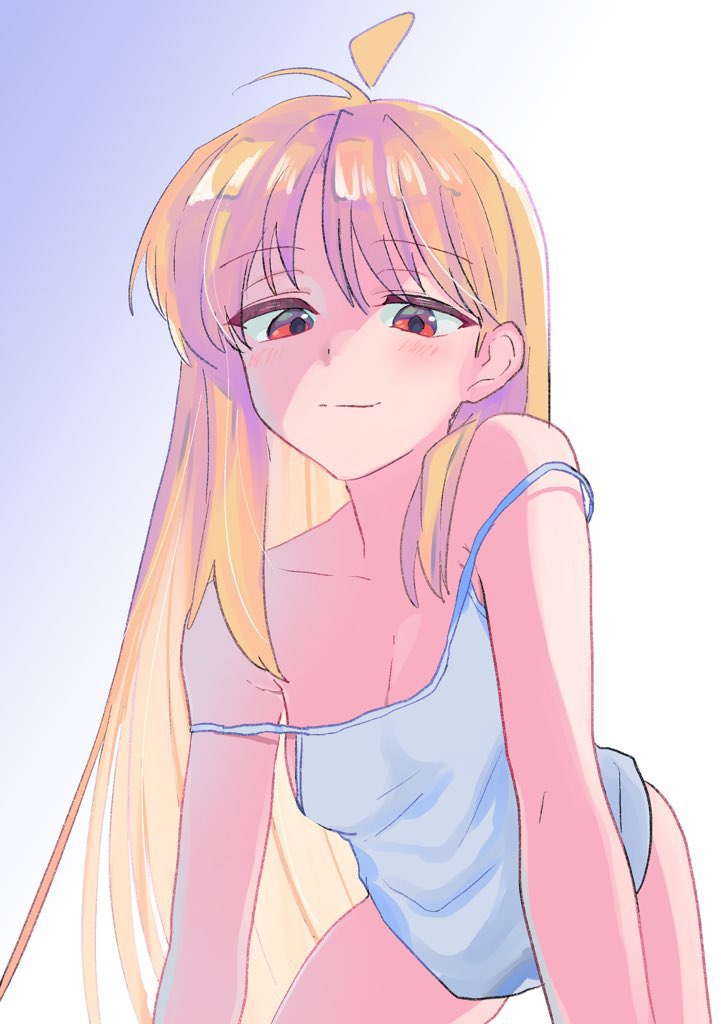 1girlahogeall foursaqua camisoleblonde hairbreastscamisolechoppy bangscleavageclosed mouthcowboy shotdouble strap sliplong hairlooking at viewerno pantsred eyessmilesolospaghetti strapstraight hairstrap slipvery long hair