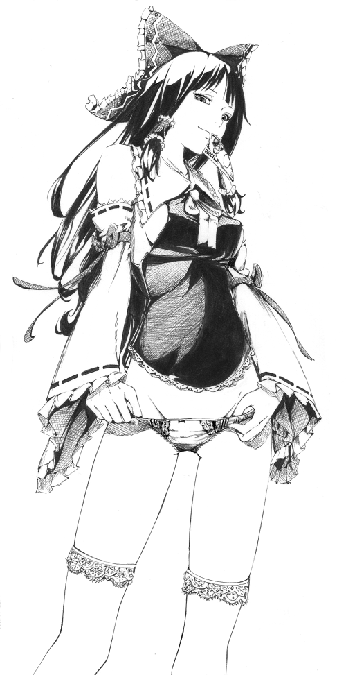 1girldetached sleevesfemale focusgreyscalegroinlong hairmoneymonochromemouth holdpantiespanty pullsolothighhighsunderwear