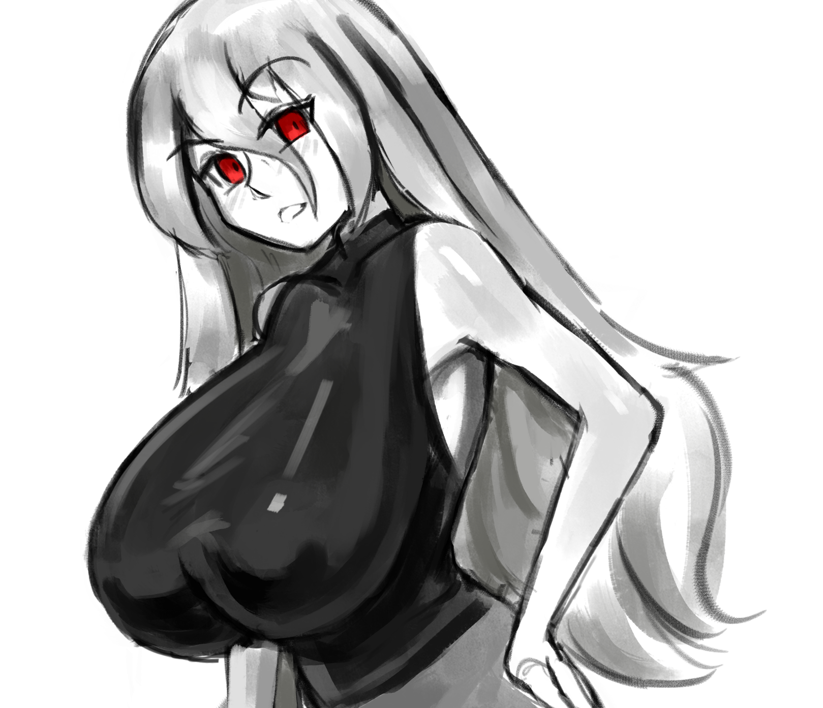 1girlbreastshand on own hiphuge breastslong hairlooking at viewerred eyessleevelessupper bodyvery long hairwhite backgroundwhite hair