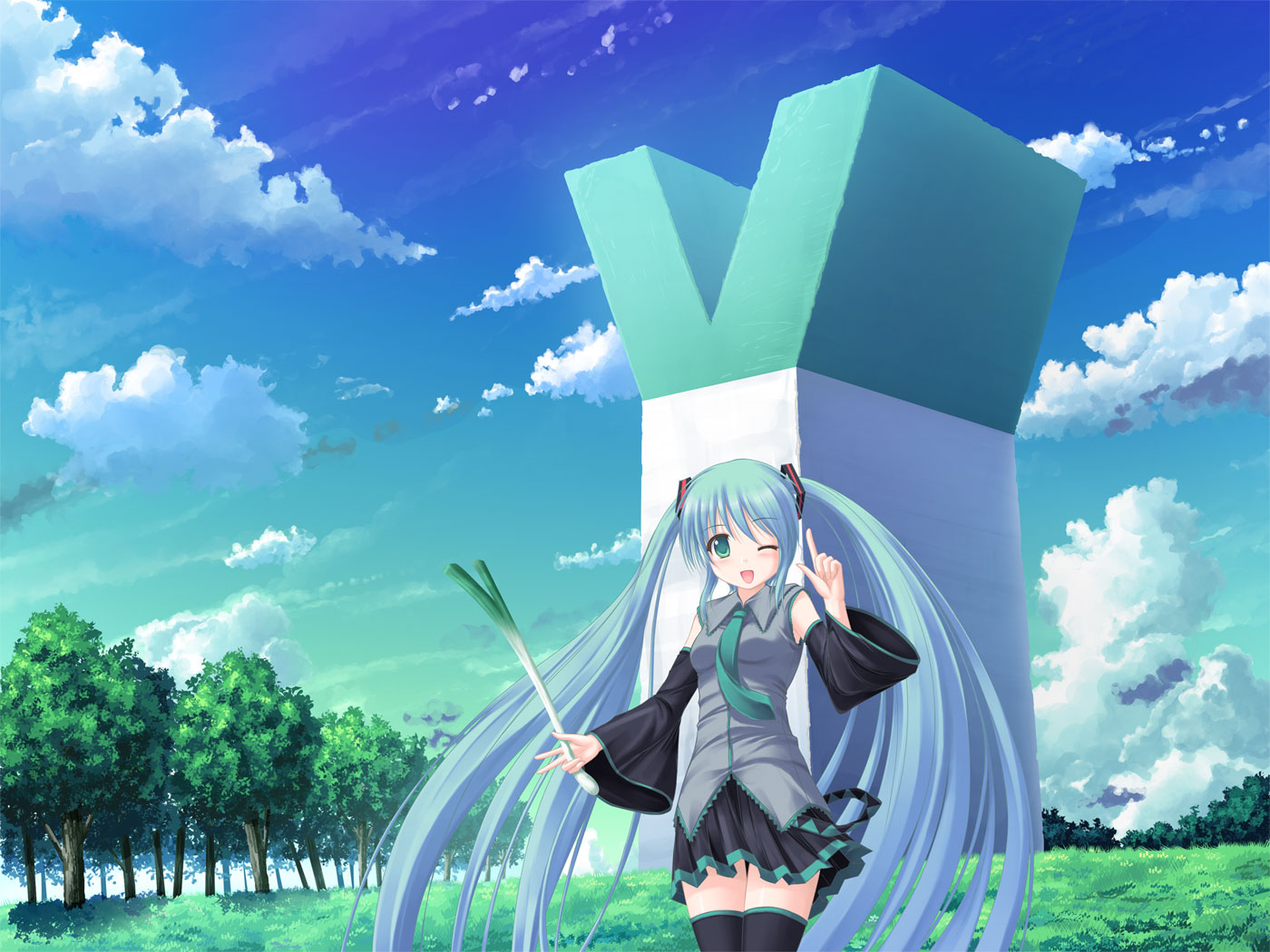 1girlclouddayfemale focuslong hairone eye closedopen mouthskysolospring onionstatuethighhighstreetwintailsvery long hairwink