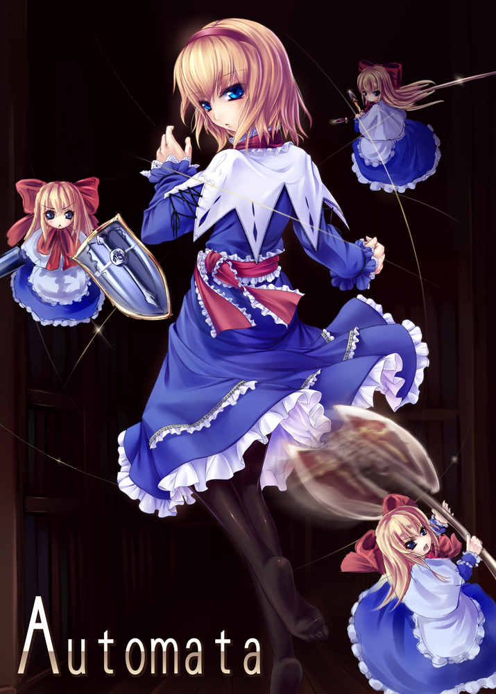 1girlaxeblonde hairblue eyesbowdollfeetfemale focushair between eyeshair bowhairbandlancepantyhosepolearmshieldshort hairsolessolospearstringswordweapon