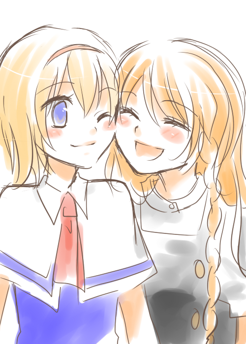 2girlsblonde hairblue eyesbraidcheek-to-cheekclosed eyesfemale focushairbandheads togethermultiple girlsone eye closedshort hairwhite backgroundwink