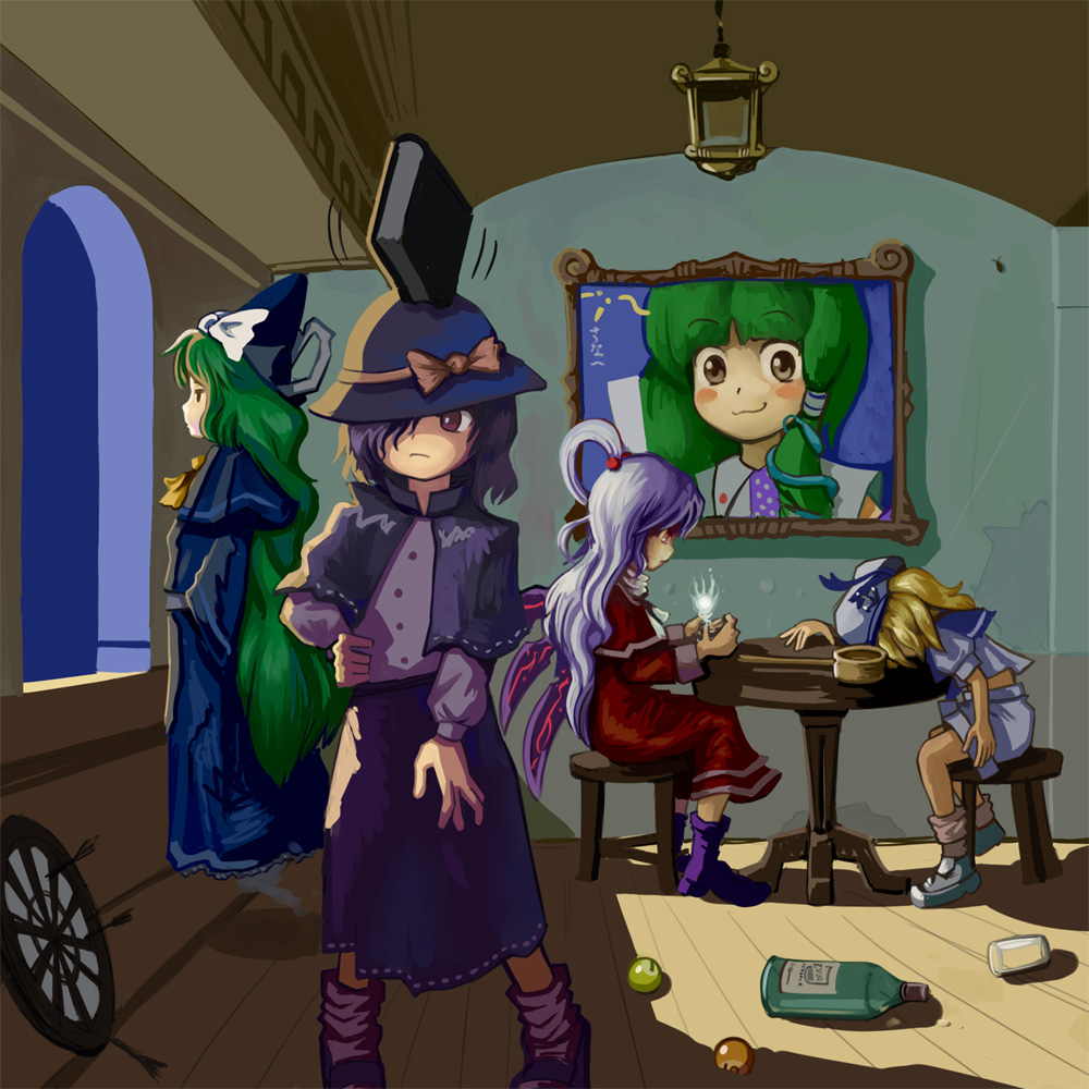 :34girlsballbilliard ballbilliardsblonde hairblushbookbottlecapeletdartdressfemale focusghost tailgreen hairhair bobbleshair ornamenthathishakuladlelamplong hairlong sleevesmultiple girlspainting (object)parodyponytailred eyesribbonribbon trimribbon-trimmed capeletsailorsailor hatshirtshort hairshort sleevessittingskirtsleepingsmilestyle parodywindowwingswizard hatzun (style)
