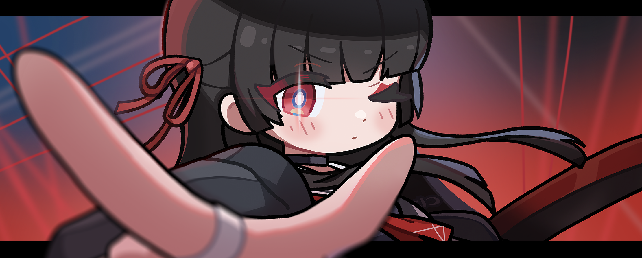 1girlblack chokerblack hairchibichibi onlychokerclosed mouthgradient backgroundhair ribbonletterboxedlight blushlong hairlooking at viewerneckerchiefone eye closedoutside borderred eyesred neckerchiefred ribbonribbonsoloupper bodyyami (yami56 u)
